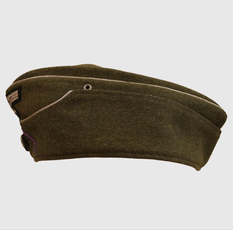 A rare piece of headdress from the army being a size 57 officers overseas cap, completely moth free. Silver piping to the crown and front scallop of the cap. Fitted with the officers heavy bullion wire eagle with matching bullion cockade. Inverted V waffenfarbe of violet for the Chaplains Department. Between the eagle and the cockade there is a small size Chaplains Cross fitted. To the interior the grey green satin lining in excellent condition with a light tan leather forehead sweatband, the sweatband is stamped ‘Qualitat Marke’. Accompanying the hat is the photograph of the original owner of the cap wearing his Chaplains uniform but in this photograph wearing the visor cap.