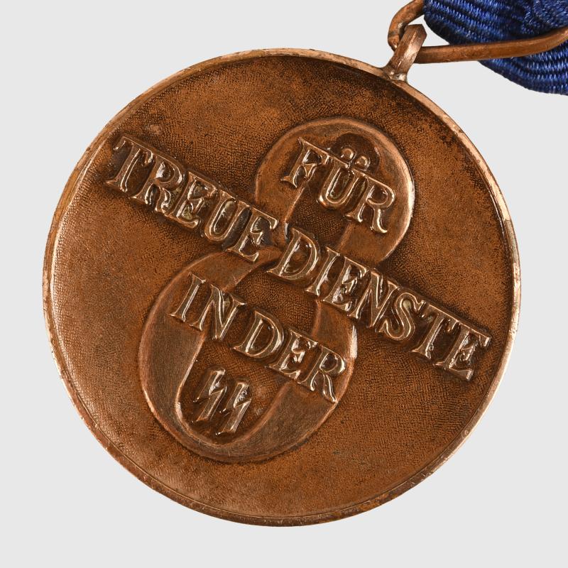 A cleaned and possibly lacquered example of the SS long service medal for eight years service, some slight edge knocks with its section of blue watered silk ribbon.