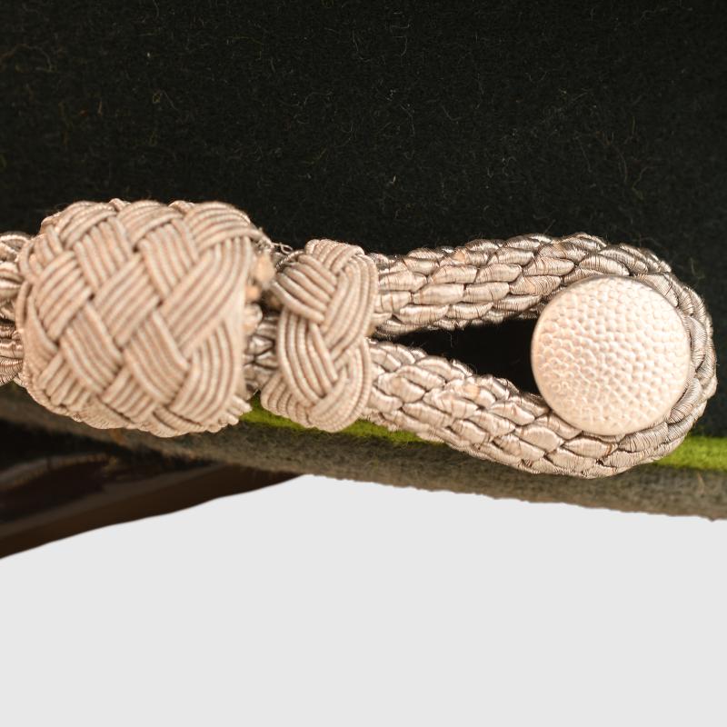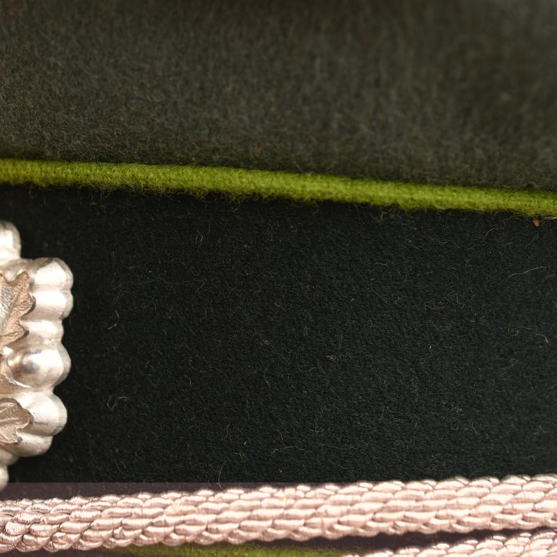 A huge size cap, possibly 59 or 60, constructed in the soft Melton material. One minor pin head size moth nip to the crown, another similar size on the left hand overhang, otherwise no indication of any moth damage anywhere else on the cap. The light apple green piping contrasts beautifully against the grey on the top of the hat and the dark green centre band, of which there is a row of apple green piping on the lower and upper side of the centre band. The cap is fitted with a bright stamped aluminium eagle with matching cockade, the central metallic cockade is of the vented type, the cap is also fitted with a standard set of officers cap cords. Some creasing and crazing to the exterior of the fibre visor. The light tan sweatband shows evidence of wear use. The Erel trademark to the leather band still visible. The golden lining to the interior has shot in one place. The ‘EREL SONDERKLASSE’ lozenge in silver is all complete and visible underneath the undamaged centre celluloid lozenge. A superb cap in a rare waffenfarbe. More extensive, extra images can be seen on our new Premium website, type in regimentalsmilitaria.co.uk in to your web browser.