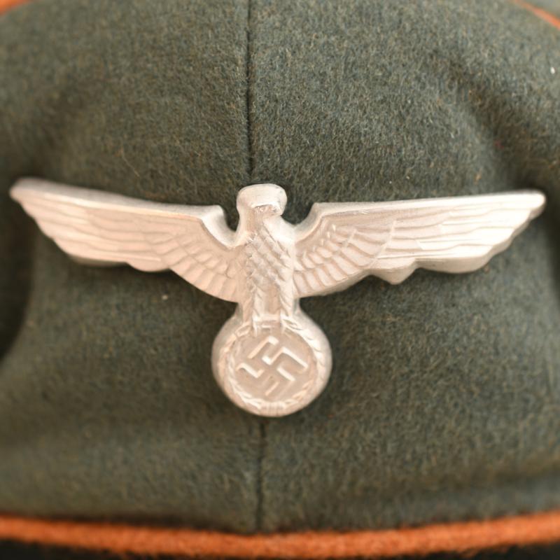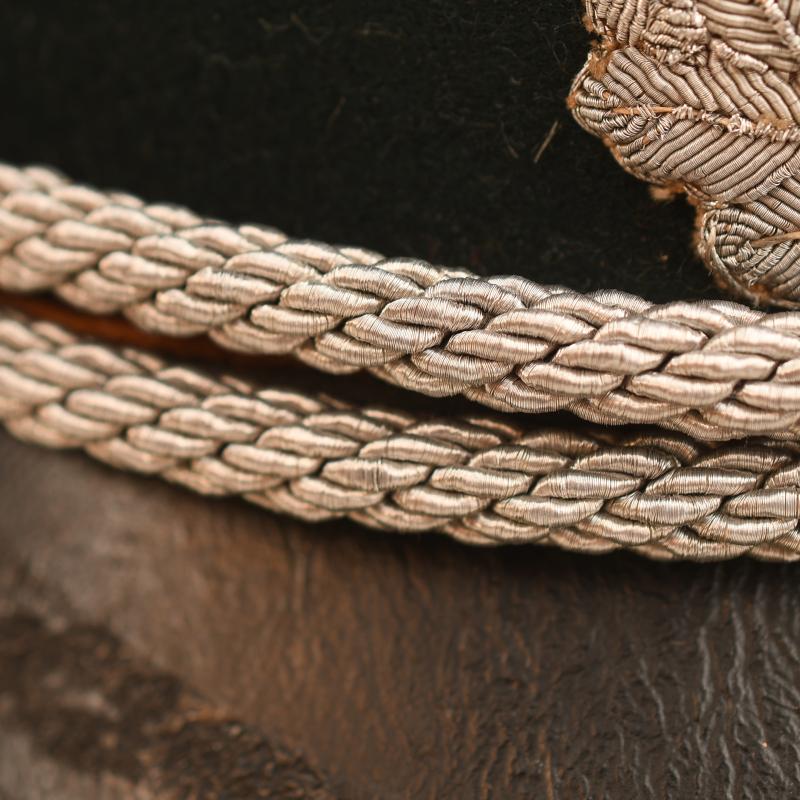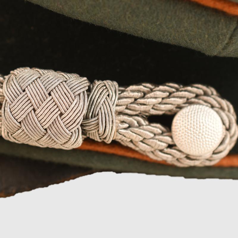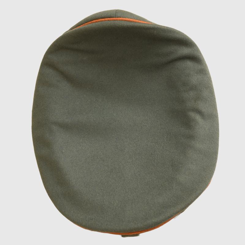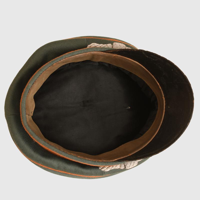 Non size stamped but on test it is possibly 57, constructed in soft Melton material. There is no moth damage anywhere to the crown of the cap, the copper brown piping standing proud against the field grey of the top of the cap and against the darker green to the upper and lower sections of the centre band, this piping was only worn up until early 1943. Stamped aluminium national eagle, bullion wire cockade with metallic centre, standard set of officers cap cords. Soft crushable peak. The interior sweatband in grey leather and has evidence of wear use. The interior lining in straight black without any indication of a central lozenge or makers mark ever fitted. More extensive, extra images can be seen on our new Premium website, type in regimentalsmilitaria.co.uk in to your web browser.