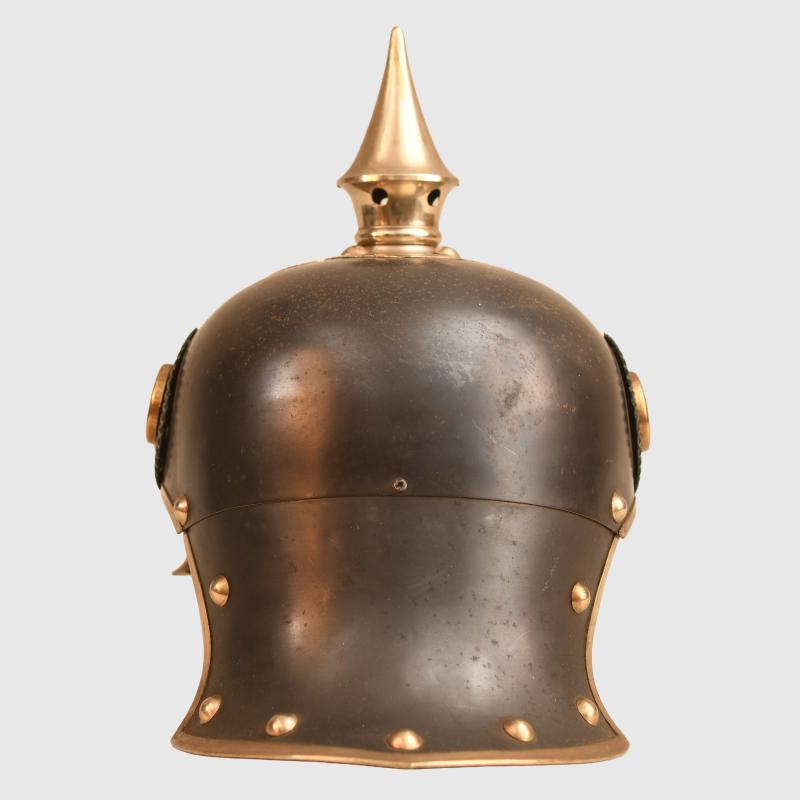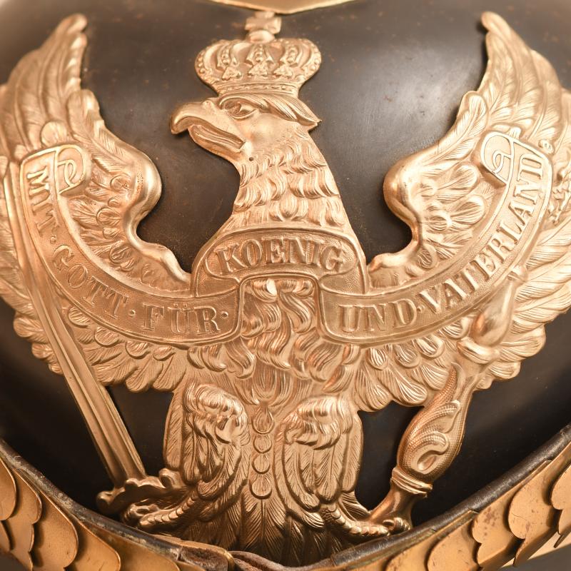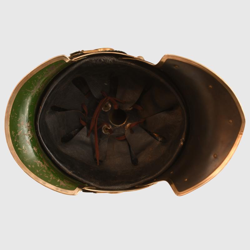 The quite unique style of helmet worn by all of the 13 Jager Zu Pferde Regiments, Regiments 1 through to 7 had the same blue skull but wore white fittings to the spike, spike base, front plate and edges of the helmet, the chin scales, which are domed and clip-on are always in brass. This skull is in excellent condition with a very minor amount of rust bleed through the blueing. All the fittings are nice and clean, undamaged, all the leather backing to the chin straps complete. The helmet is still complete with its correct large size State and national cockades. Stamped sized ‘55’ to the rear inner edge trim, complete with its 9 tongued leather liner and what appears to be a replacement drawstring from a shoelace. Maker marked to the upper inner skull close to the hole for the spike base, the end of the maker’s name is half obscured by one of the washers holding the dome nut to the helmet, the first half of the name ‘A Wunder’ and the manufacturing town appears to be Neufchatel. More extensive, extra images can be seen on our new Premium website, type in regimentalsmilitaria.co.uk in to your web browser.