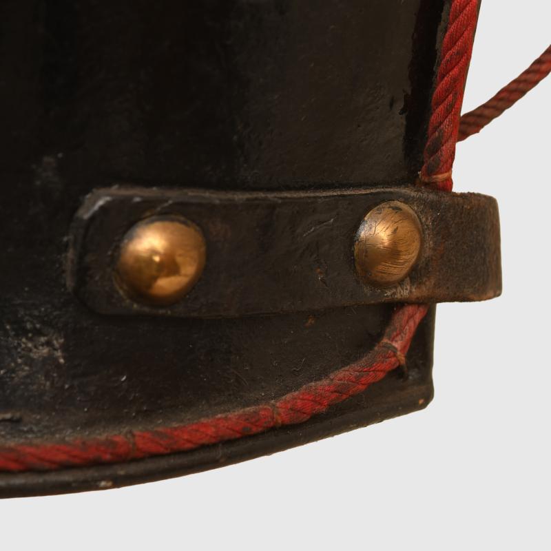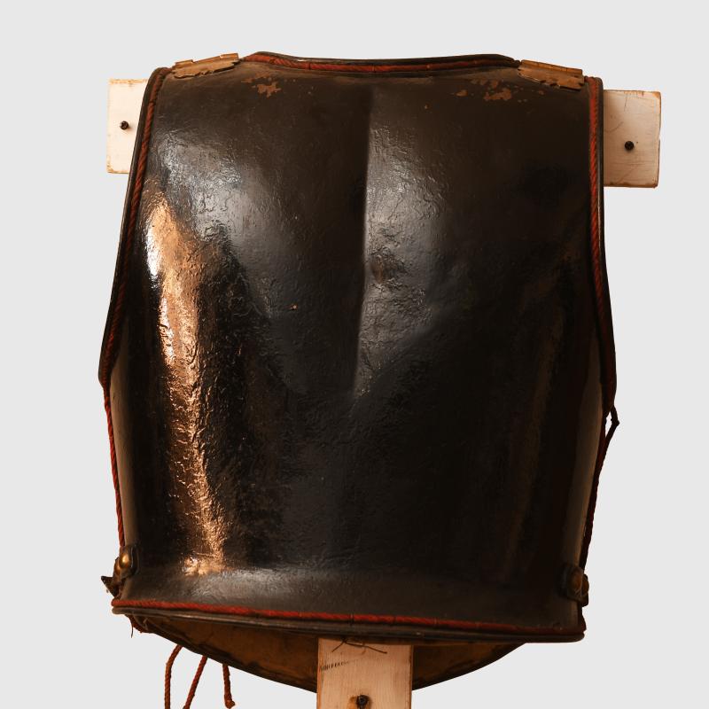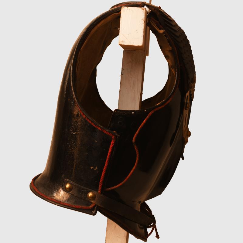A generally very nice condition enlisted ranks or NCO all black cuirass worn by the Guard Du Korps. The red cording to the edges is loose in places but generally complete. All the black finish good and complete on both sides. The interior lining is complete and marked to the ‘5.E’ (6th Squadron). The front straps complete with the centre part of the strapping blackened with brass clips. The 2 studs to fit to the connecting straps are marked to the 6 c, To the centre of the cuirass is the 1912 added coat of arms with its original waist strap. A fine addition for a display with an enlisted ranks or NCO Guard Du Korps helmet. More extensive, extra images can be seen on our new Premium website, type in regimentalsmilitaria.co.uk in to your web browser.