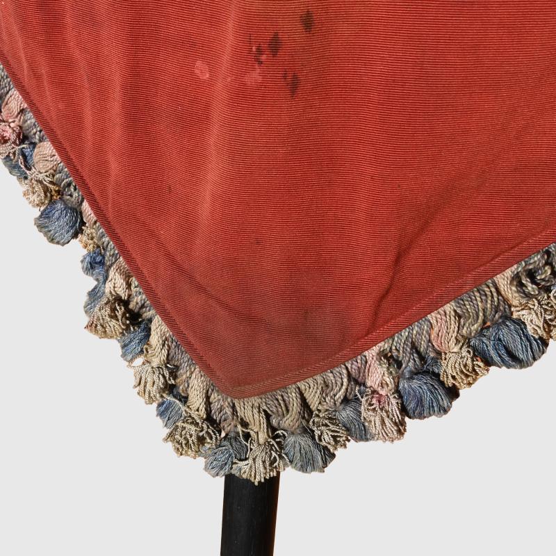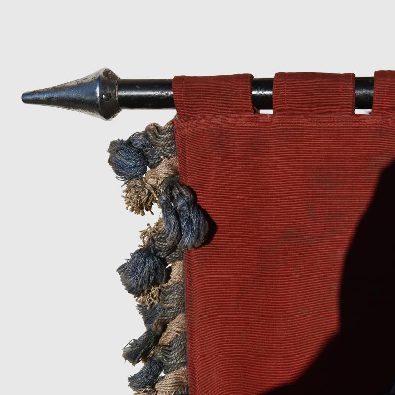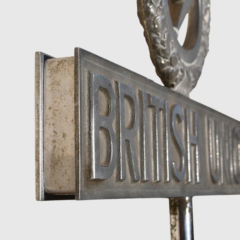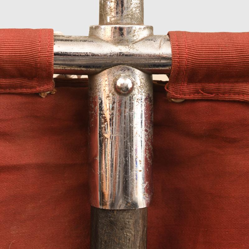 In all of our 50 years in handling items of military and political memorabilia we have only ever managed to obtain three of the British Union of Fascist banners and have never been able to obtain the banner top. This British Union of Fascists banner top measuring 50cm across the name box and 43cm from the base of the box to the point of the spear top. During the post WWI period the rise of fascism across Europe accelerated, it started firstly in Italy with Benito Mussolini’s march on Rome in 1922 with, at the same time, the fledgling NSDAP in Germany was growing in strength. In 1922 a sketch was made in Germany of the soon to be called The Deutschland Erwache Standard, the sketch in itself was possibly a copy of what the fascist Italians were already using, which they in turn had copied from the Roman legions. This British Union of Fascist banner top is a direct copy of those two nations political parties banner tops. Many images can be seen of this banner and banner top being used on marches in and around Great Britain by Sir Oswald Mosely’s British Union of Fascists, most notable is the 1937 march in London which can be seen in moving images on You Tube where the banner bearer is leading the march. On the outbreak of WWII Sir Oswald Mosely and his wife both the leaders of the BUF and other notable BUF officials were interned in the Isle of Man. After WWII the British Union, as it was then known, was reborn and these banners and banner tops were used again until the early 1950’s. Where and who by these banner tops and banners were made is unknown, it is estimate that no more than 60 were ever completed, the BUF did have one particular company that sourced a lot of their insignia and badges. The top and box are made of aluminium and constructed in a fashion very closely following the German name boxes on their Deautschland Erwache standards, but the British Union boxes were in a heavier material, the pole ends and below for suspending the banner itself are plated steel fittings a good degree of the plating still remaining although lifting in places, with the interim poles being in wood. The banner itself 82cm x 63cm that was hung from the pole of the banner top. The Red ribbed material backing cloth with applied laurel leaf with the central British Union of Fascist device of a white lightning bolt. The banner is edged with blue and white coloured thread tassels. The reverse has a plain backing cloth. The 8 suspension straps are all complete and are secured with two press studs to each loop. The banner has seen much service and it is with some slight discoloration of flooding of colour from the red backing material onto the white laurel leaf circlet to the centre, also minor staining of service wear but no damage, the wood pole is non contemporary. A Fabulous item of British Political history. More extensive, extra images can be seen on our new Premium website, type in regimentalsmilitaria.co.uk in to your web browser.