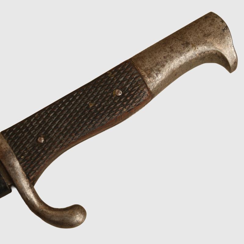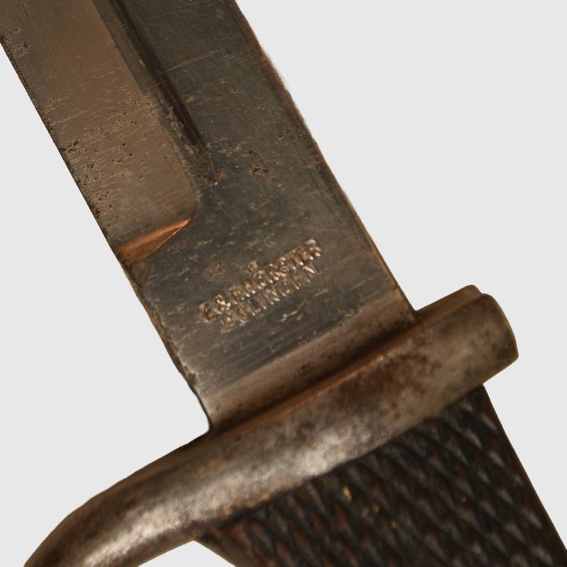 An unusual variant in the many trench knives available having an excellent bladed blade by E & F Horster of Solingen. Slight lifting to the plating but generally nice bright blade. Steel cross guard with steel eagle’s head pommel. The shape of the hilt is different than other knives of this style. Fitted into its original black painted scabbard, which has lost its leather hanging strap. The sale of Knives, other Edged Weapons and Firearms are restricted to those aged over 18. Verification of age is required before purchase is concluded, this will include providing a scan of photo ID including your address and in some cases may require video verification by FaceTime or WhatsApp video, at Regimentals discretion, until formal laws on this requirement are enforced in the UK.