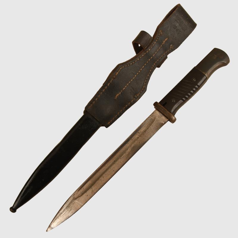 Standard K98 bayonet but without any Wehrmacht acceptance stamps. Excellent clean blade by Alcoso with upper fuller to the blade. Standard bayonet fixing. Bakelite grips undamaged. To the flat backed upper edge of the blade a waffen amt stamp with a small eagle with short wings. Standard steel scabbard, which has been repainted and its original frog, which is maker marked and dated ‘1941’. The sale of Knives, other Edged Weapons and Firearms are restricted to those aged over 18. Verification of age is required before purchase is concluded, this will include providing a scan of photo ID including your address and in some cases may require video verification by FaceTime or WhatsApp video, at Regimentals discretion, until formal laws on this requirement are enforced in the UK.