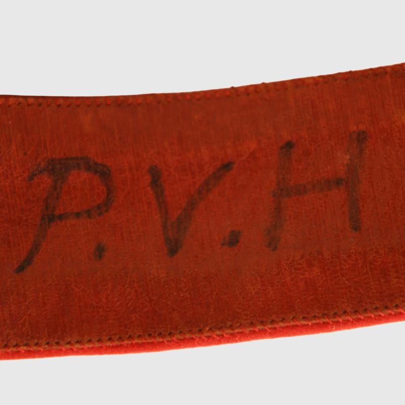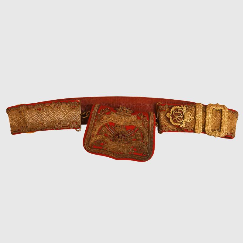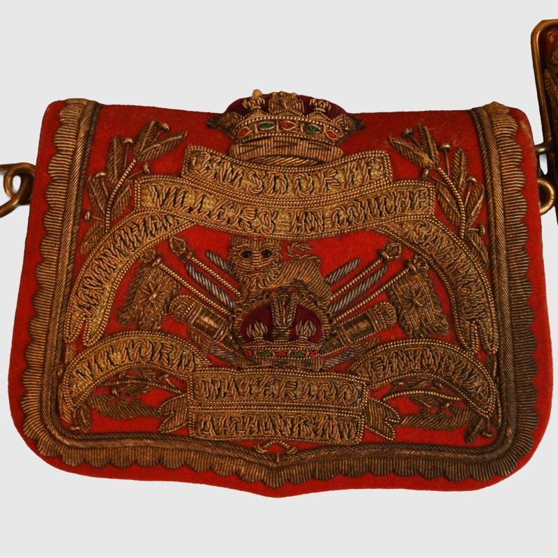 A near mint condition pouch and belt, the pouch itself is completely free of moth, red base cloth with the highest quality hand embroidery available at the turn of the 19th to 20th century. This is a Kings Crown pouch with its matching Kings Crown belt. All of the Battle Honours of the Regiment up until the turn of the century on the pouch. The gold bullion wire is virtually mint bright, with its two attachment clips. The cross belt has good bright lace with all of the gilt to the metallic fittings good and bright. One of the brass studs that secures the belt to the pouch is complete with the pouch but has come adrift from its fixing point. The owner’s initials of ‘P V H’ are applied internally to the red leather of the cross belt. The Regiment first raised as the Regiment of Light Dragoons in 1759 known as the 15th Regiment of (Light) Dragoons with subsequent service right up until after the First World War the Regiment was retitled 15th King’s Hussars and was amalgamated with the 19th Royal Hussars in 1922. The Regiment paid an notorious role in the notorious Peterloo massacre in August 1819 when within the bounds of the United Kingdom a 60,000 strong crowd calling for democratic reform charged the Yeomanry, the Hussars were ordered to charge resulting in 15 fatalities as many as 600 were injured.