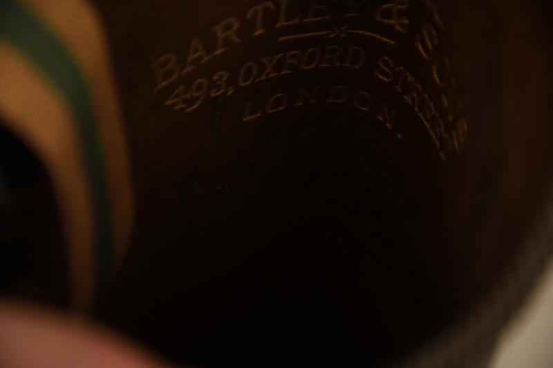 A quite worn pair of Hussar officers boots, the gilt lace around the top of the boot and the oval boss have dulled to a silver colour. Maker marked to the interior ‘Bartley & Sons, 493 Oxford Street, London’ with an owner’s name inside of ‘J S Wyam Esquire 13th Hussars’. The lace to the top of both boots slightly loose with some stitching as found. The shoe section slightly distorted, the boots need softening and reshaping. Please do not ask for sizes, these boots are not for wearing only for mannequin display.