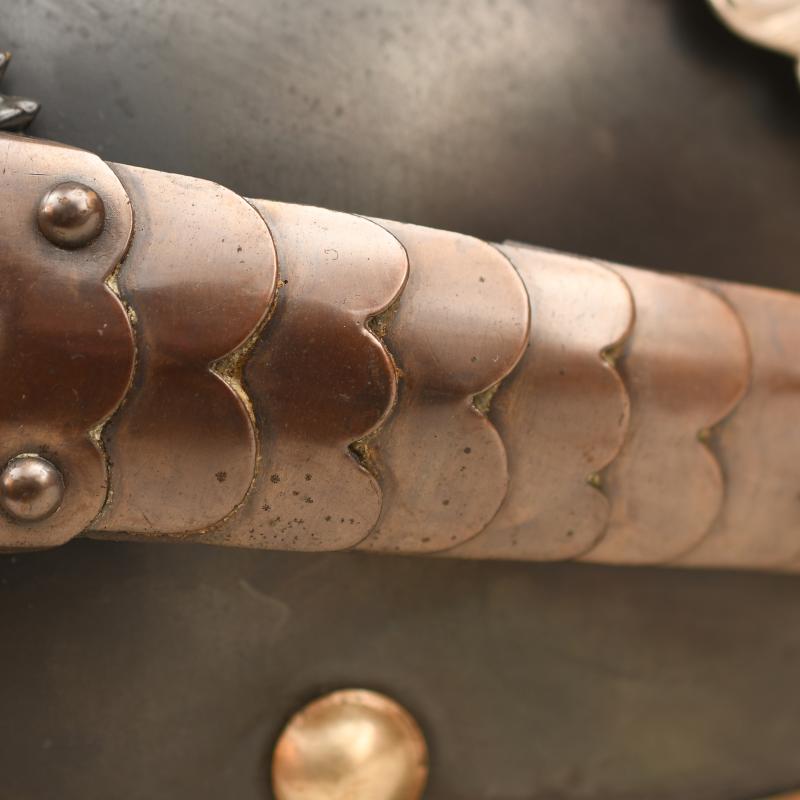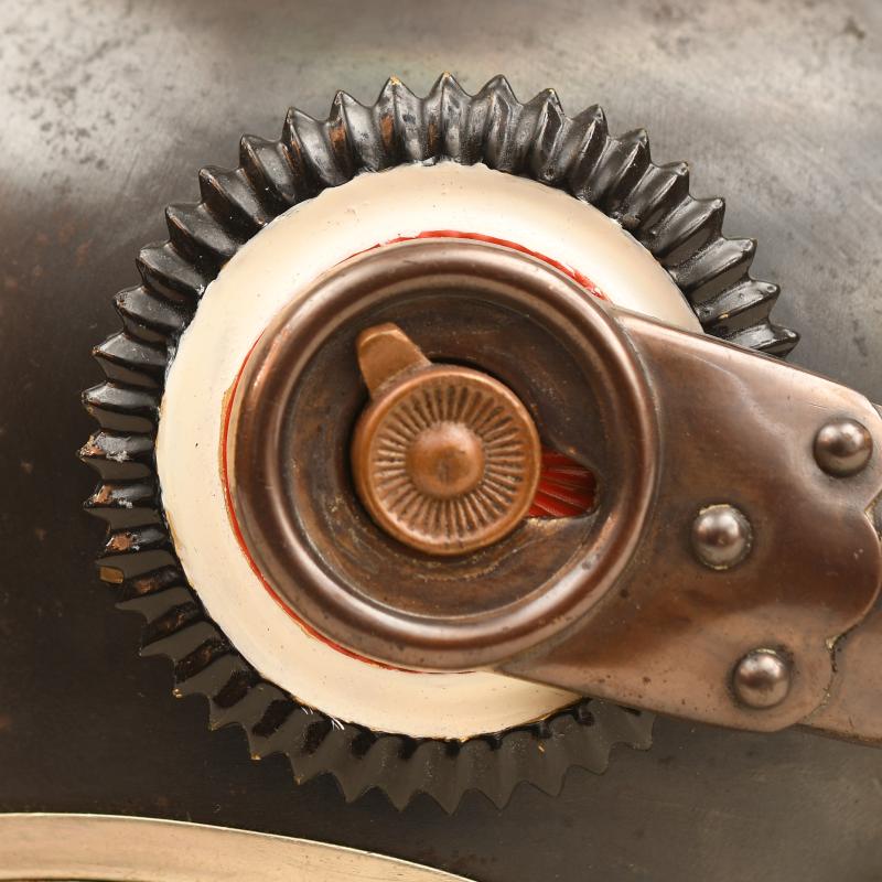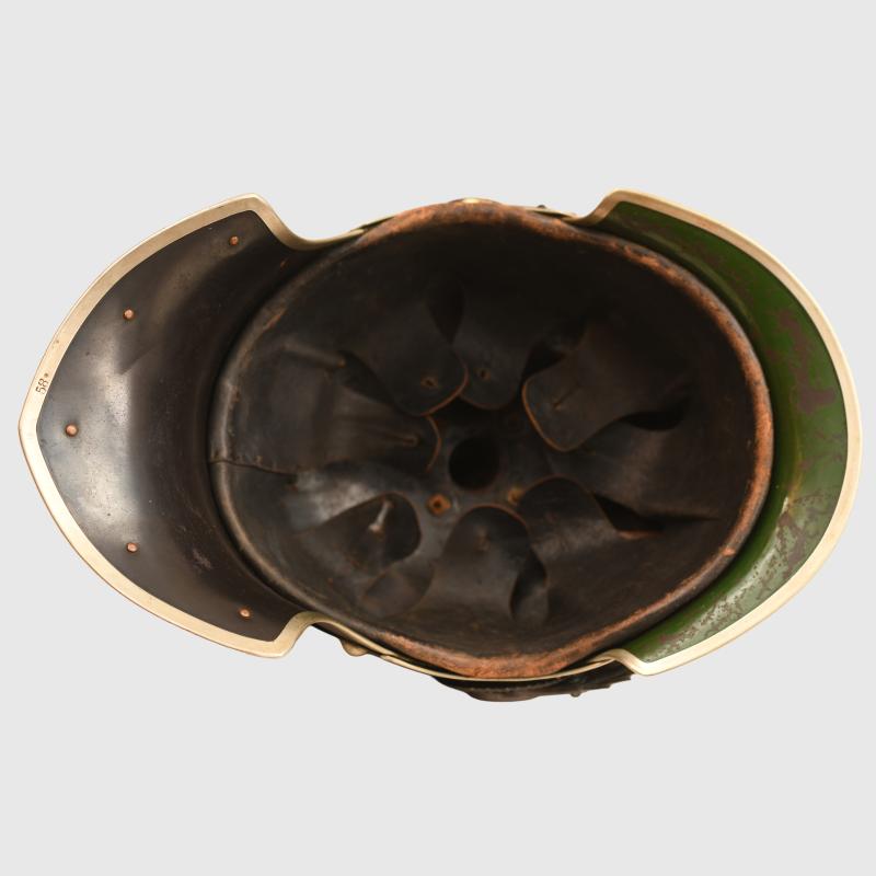 A very clean and large size 58 skull lobster tail helmet for regiment number 5 of the 13 Jager Zu Pferde regiments. Maker marked Wunderlich to the interior skull to the upper inner crown, all of the blued finish remaining to the lobster tail exterior, all of the fittings in white metal, ( the JZP regiments from 1 -7 were all in white metal fittings) with the exception of the brass domed clip over chin scales, the helmet with its totally original large size state and national cockades, to the rear inner lobster tail stamped size 58, with its original eight tongue leather liner, over the last 50 years we have had many of these helmets of the Jager zu Pferde, but can never remember having one that is regimentally marked, this example marked to Regiment number five and dated 1915, marked in ink blocks to the interior of the leather liner. More extensive, extra images can be seen on our new Premium website, type in regimentalsmilitaria.co.uk in to your web browser.
