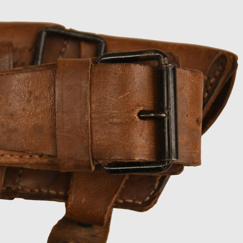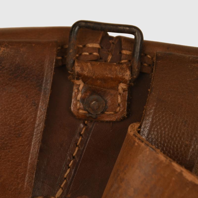 A rare and excellent condition matched pair of pouches and waist belt for the Austrian infantryman of WWI. Good matching colour overall. One of the pouches is marked ‘Wein 15’ inside the lid. Good pebbled leather to the closing flaps of all four pouches. Stitching strong overall. A scarce set. The pouches were used for carrying the ammunition for the model 1895 Mannlicher rifle. The waist belt also has regimental markings and the first half of the date, of which ‘19’ is visible, the last two letters are not visible.