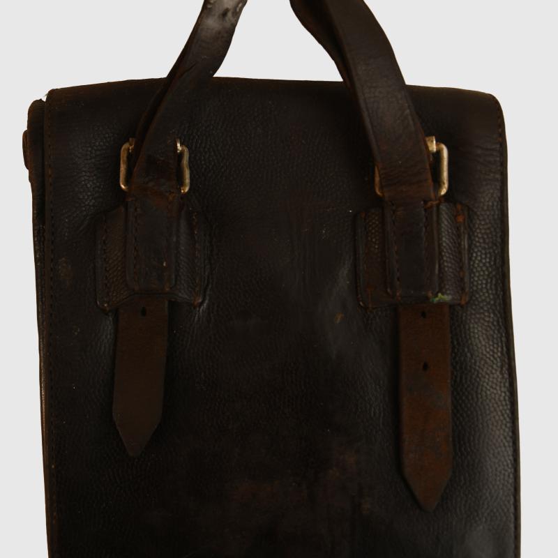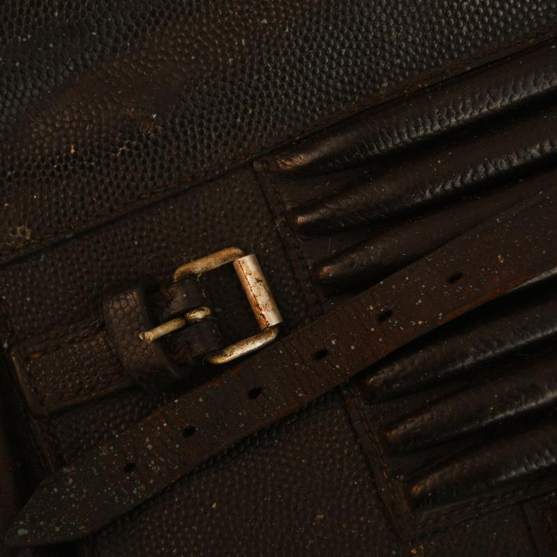 A well service used German officers map case constructed in the black pebbled leather, which has gone smooth in some places through wear. All the attachment straps are available on the reverse side. The front closing strap and buckle are complete.