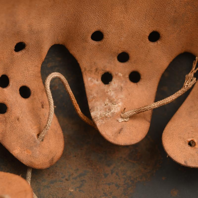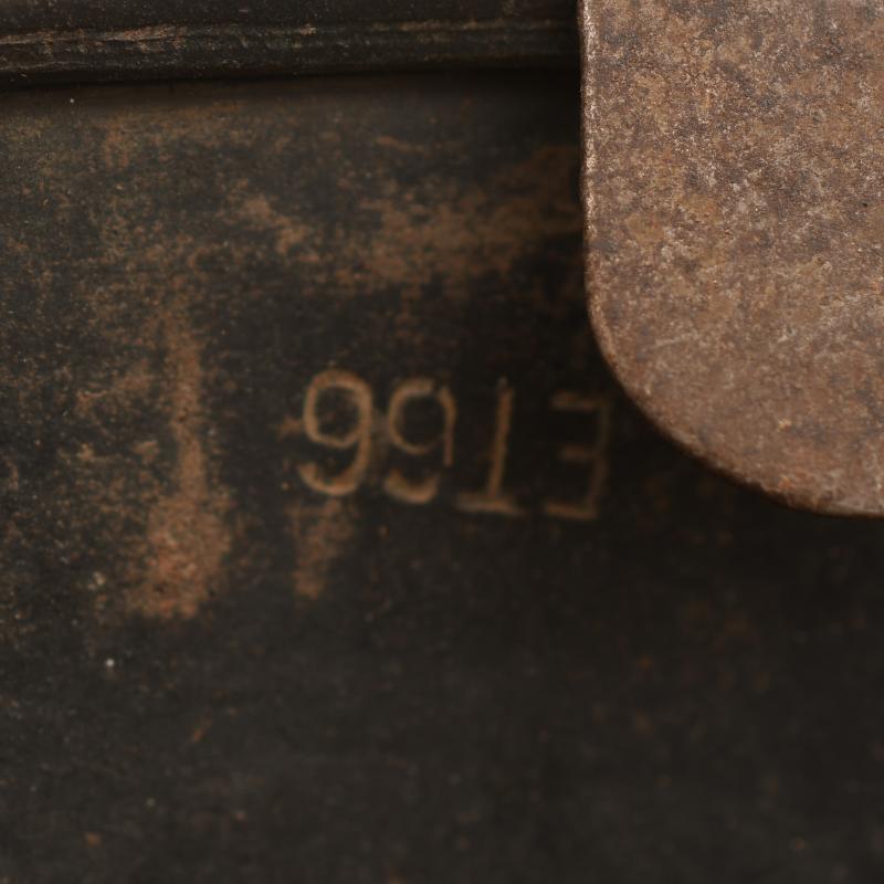 A very nice condition ‘ET66’ stamped shell, batch number ‘803’ Luftwaffe single decal combat helmet retaining all of its 1940 pattern blue grey colour. The Luftwaffe decal good and clear with just minor abrasions to the right hand wing. The paint has remained on all three liner retaining rivet heads. The liner in an absolutely superb colour, stamped size ‘58’ with the fragments of the original drawstring in place. Brown leather chinstrap, which is ‘Wutterpal’ maker marked with the 1937 date to the strap. A very ingenious soldier has created a carrying cradle out of a long buckled strap, a water bottle sprung loaded clip and two side clips out of metal and leather. Some parts of the surrounding strap of the skull a form of black composition material has been used to make sure that the cradle does not move and has left an indentation into the paintwork of the helmet itself. To the very tip of the long strap surrounding the skull is the maker mark and date of ‘1942’.