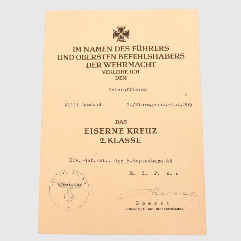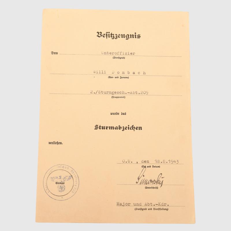 A scarce Army Assault Gun grouping of citations. Single semi hard card Iron Cross 2nd class citation, pre printed, A5 size to Unteroffizier Willi Dombach of the 2./Sturmgesch./Abt.209. Award date 5th September 1943 with light pen signature of the Unit Commander. Pre printed A5 size lightweight citation for the General Assault Badge dated 18th August 1943 to the same unit. Pen signed by Unit Commander Major Simoiski, non folded, non punch holed. Standard A5 size pre printed citation, non punch holed, non folded, by now promoted to Leutnant Willi Dombach, 14th October 1943, pen signature. Award for the East Front Medal with unidentified Obersts signature. Complete with three private photographs showing recipient and colleagues all in assault gun wrap over tunics.