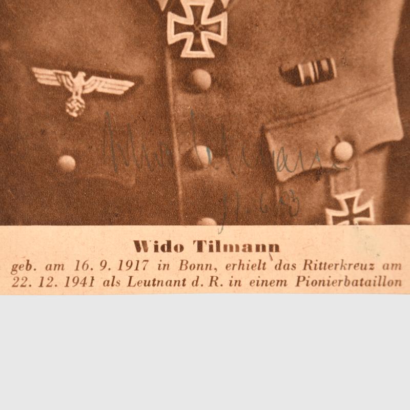 A newspaper photograph of Wido Tilmann, upper bust, hatless, wearing his Knights Cross at his neck, faintly pen signed across the breast of the uniform tunic. Accompanied by the original photograph of this signed newspaper photograph stuck into the interior of the original Hitler Youth members autograph book.