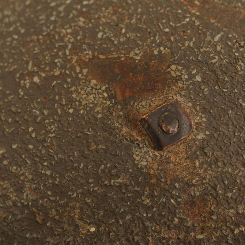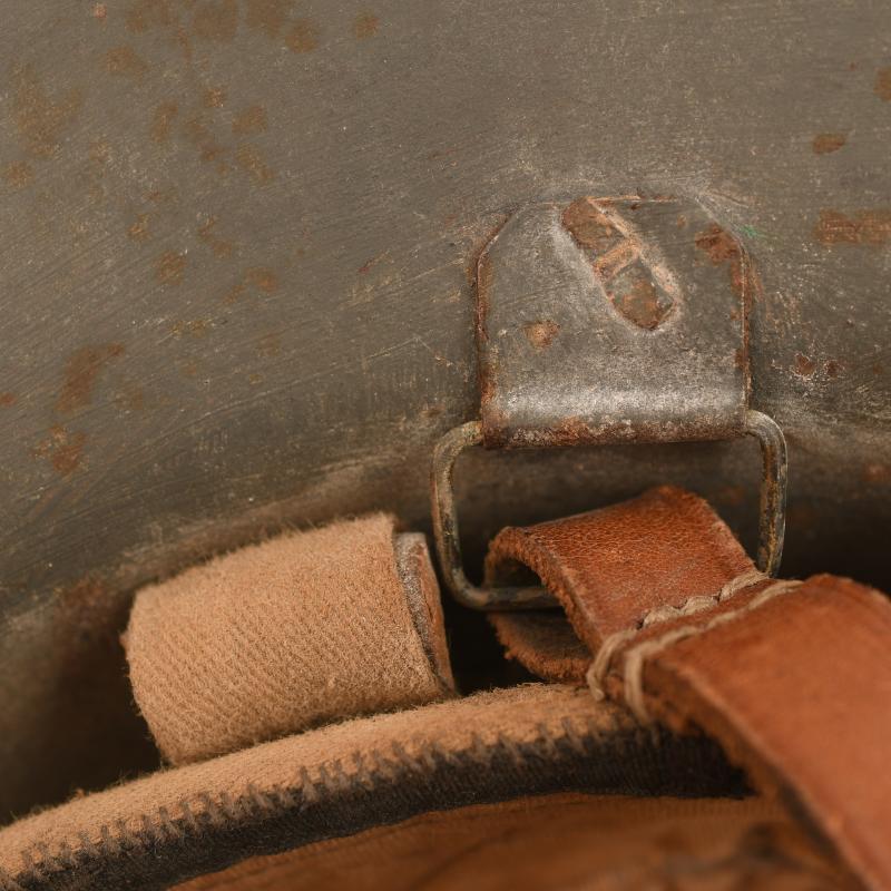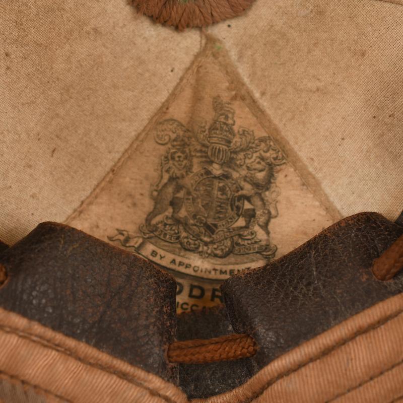 A very nice condition rough sand finish to the outer skull with the attached Royal Artillery officers badge. To the interior the officer’s liner with the very nice woven label of ‘Woodrow, Piccadilly, London’ below a Coat of Arms. A multiplicity of stitched lightweight cotton and leather with an inner drawstring, with its original brown leather chinstrap. An extremely nice condition Royal Artillery officers helmet.