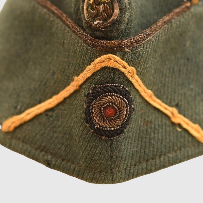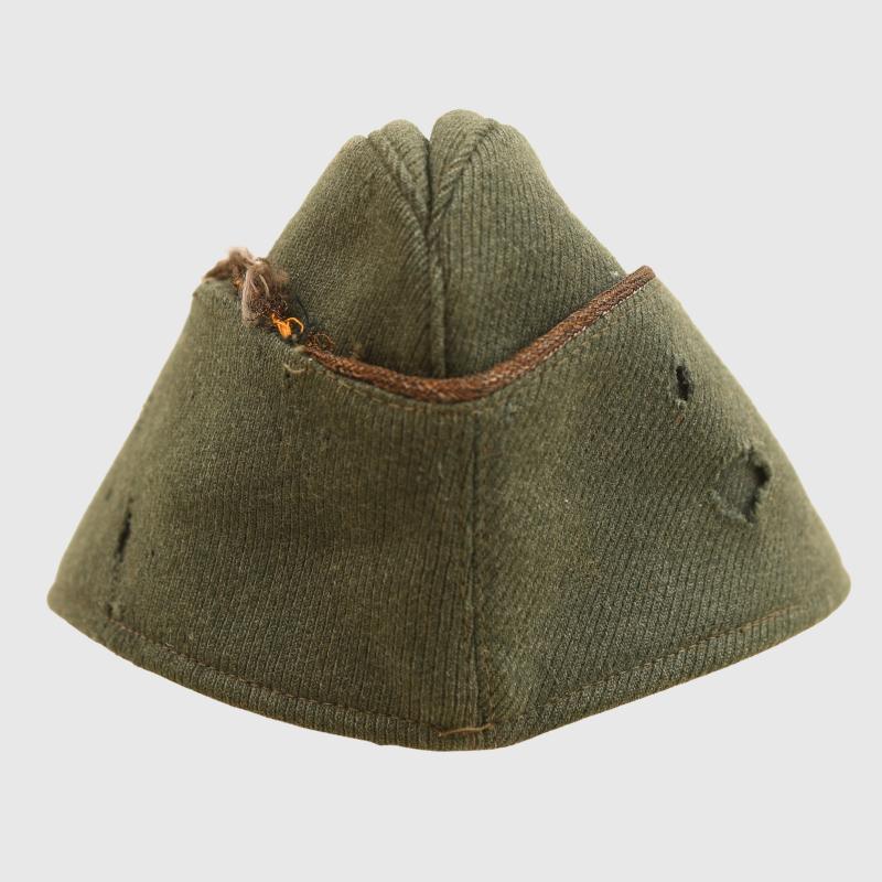 A size 58 overseas cap for a Coastal Artillery officer, constructed in the classic Coastal Artillery style of green. Two large moth holes on the left hand side, a sprinkling of smaller moth holes overall. The gGold waffenfarbe is shredded in places. Complete with its officers gold on Coastal Artillery green backing eagle, wire woven national cockade with yellow inverted V waffenfarbe. A very close matching green cotton lining, stamped size ‘58’.