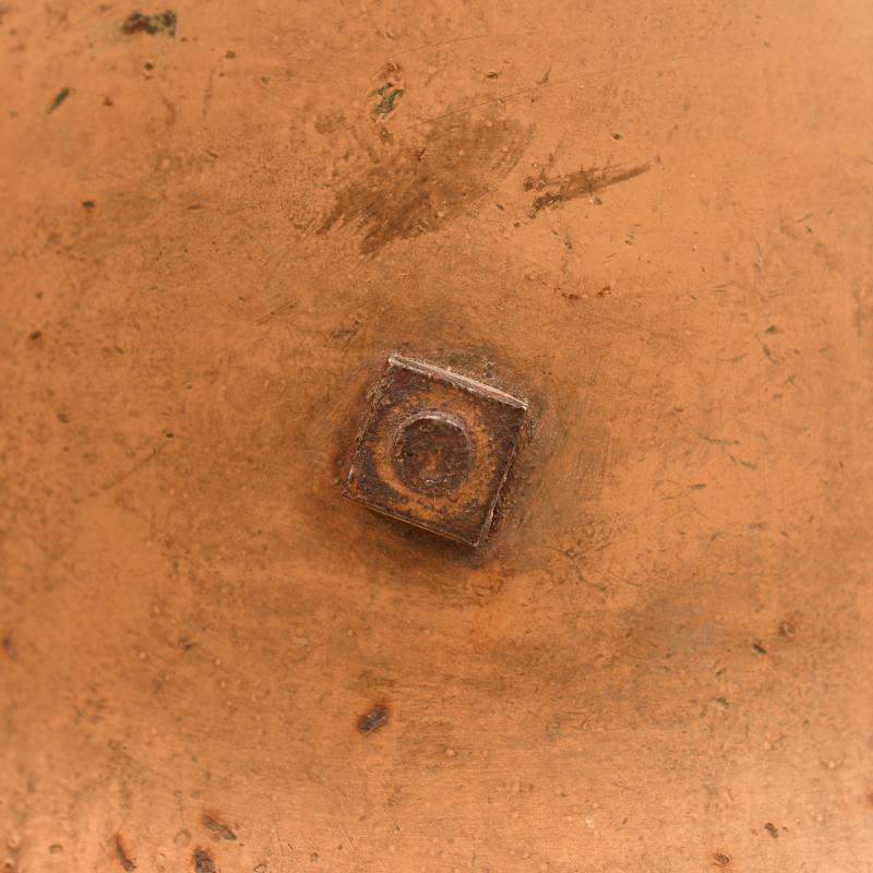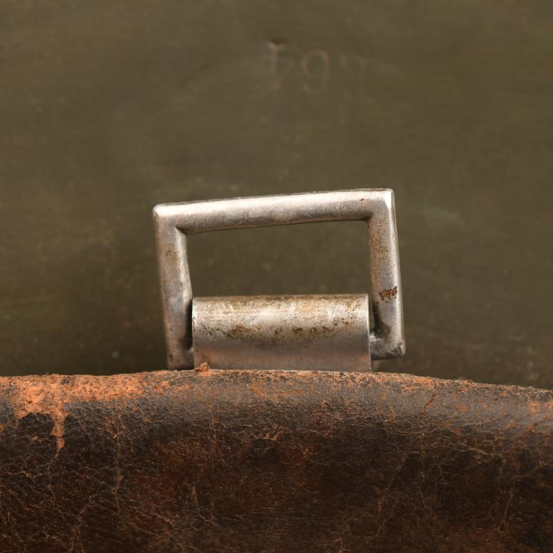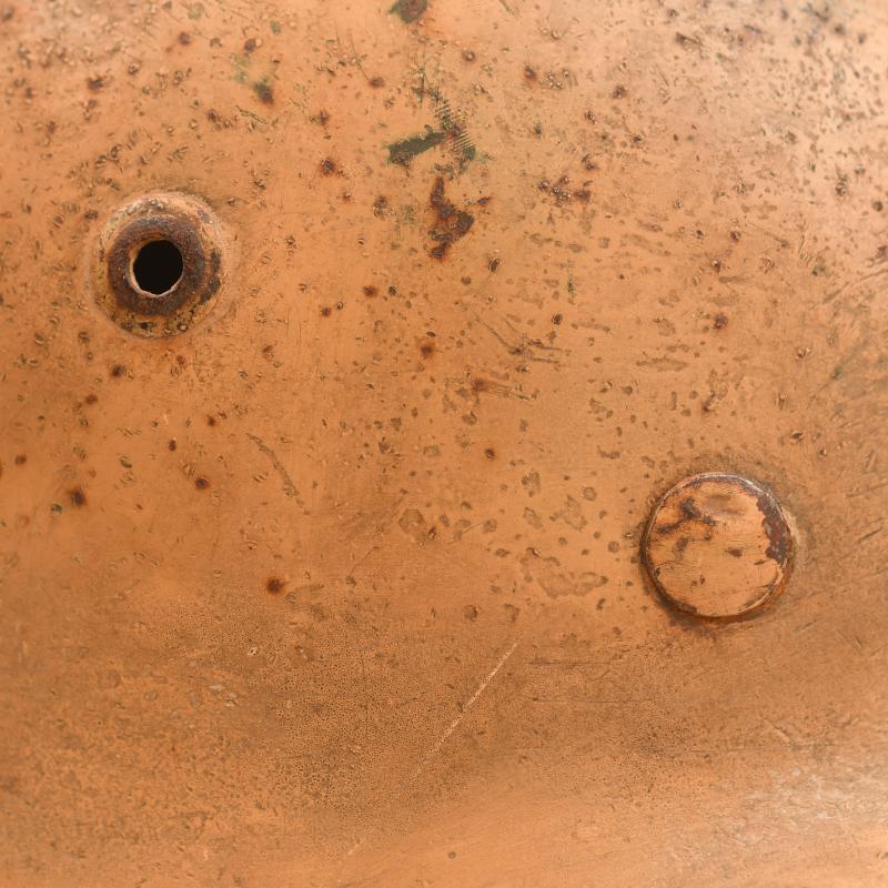 A good spray painted tropical helmet, some losses to the crown area otherwise generally complete. Original later apple green finish remaining to the interior shell. Marked ‘FE64’, batch numbers partially obscured, the remaining number is ‘23’ with M.35 interior liner, all complete, good deep colour, all tongues complete with its original drawstring, strap missing. To the rear of the helmet the original liner retaining rivet was missing and has been period replaced by a nut and bolt, the tropical paint is still attached to the nut and bolt.