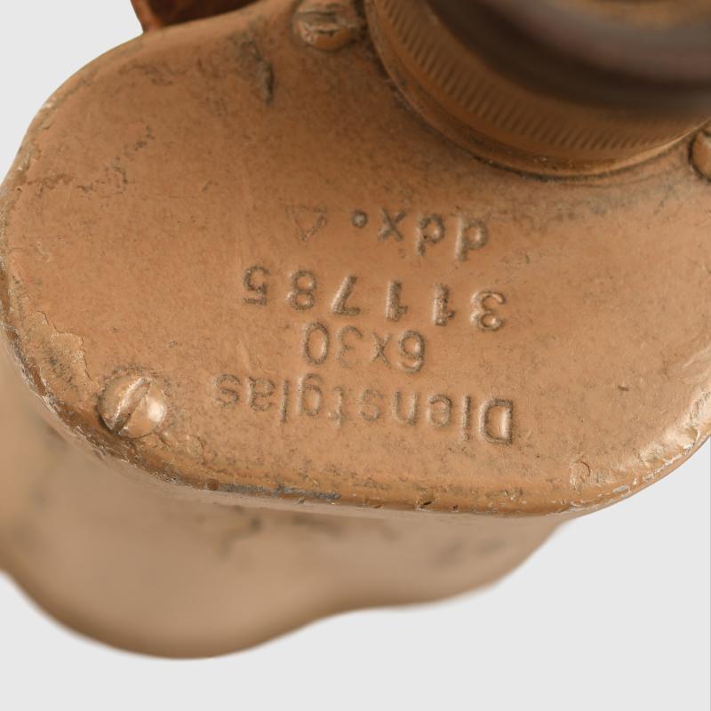 Optically good, lenses possibly need cleaning, replaced neck strap undamaged Bakelite eyepieces, marked Dienstglas 6x30 311785 , maker code DDX, some of the crackle finish missing from the main body, binoculars are tan painted.