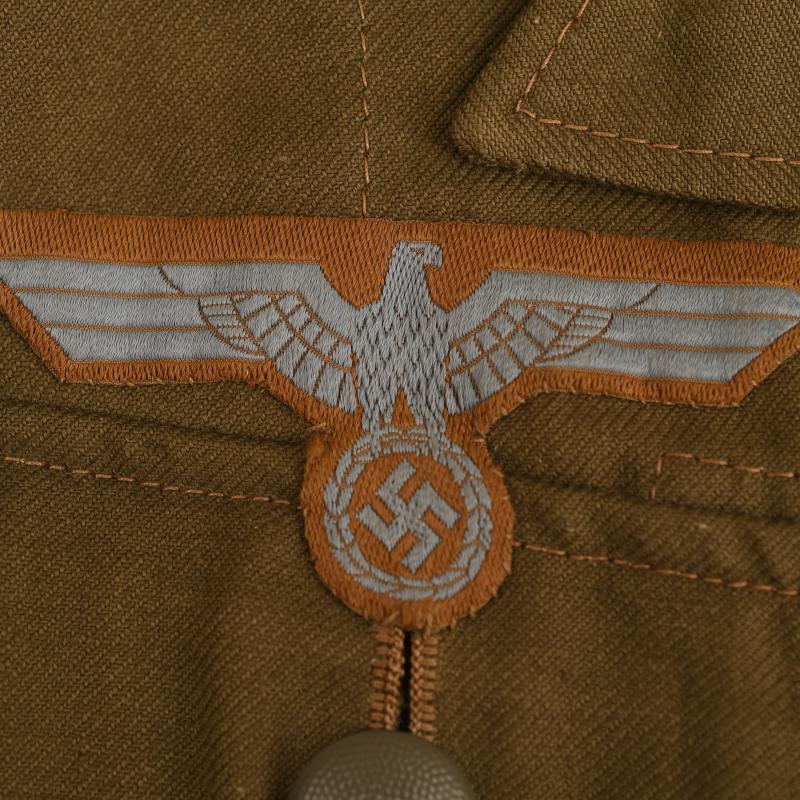 The tunic is unworn, fully size stamped with the depot code of ‘B42’, this indicates that this is a late production 1st pattern tropical tunic. Being a late pattern the eagle fitted is the 2nd pattern Bevo woven blue on tan, standard tropical machine sewn collar patches, nco tropical tress to the collar. The shoulder boards are superb being the silk piped copper brown reconnaissance colour, the material of the shoulder boards match the tunic exactly and have grey underlay indicating that they are 2nd pattern period 1942 production shoulder boards. All of the buttons are removable. The maker mark of ‘Wilhelm Viohi & Co Berlin’ stamped to the bandage pocket. Upper medium size. It would be extremely difficult, if not impossible to find a tunic in such unused condition and with this rare arm of service piping to the shoulder boards. More extensive, extra images can be seen on our new Premium website, type in regimentalsmilitaria.co.uk in to your web browser.