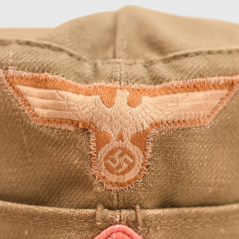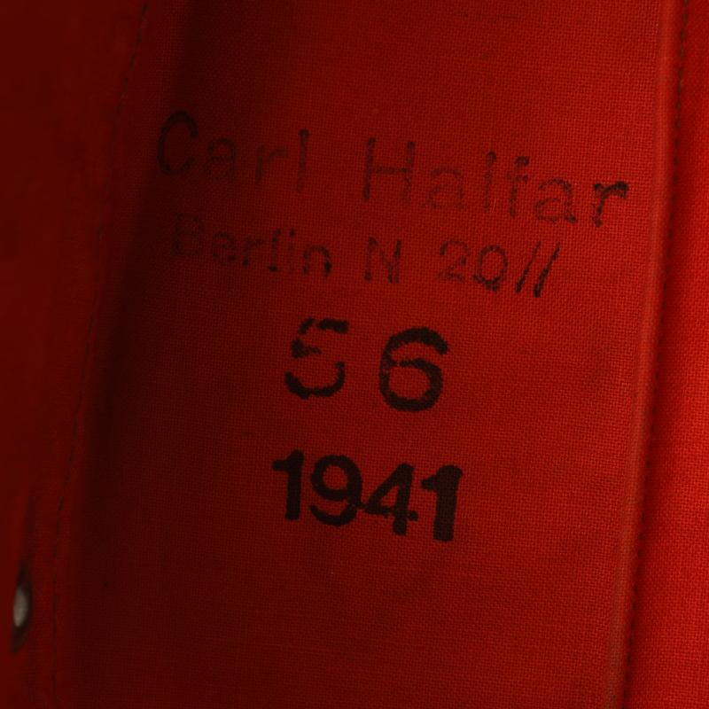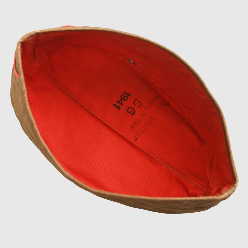 This example is the far more difficult example to find being in the heavyweight material identical to tunic weight cloth, many others on the market are of the lighter weight variation, this is the most desired constructed enlisted mans overseas cap. Standard red lining. Size 56, dated ‘1941’, having the ‘Carl Halfar, Berlin’ maker’s stamp inside, normally the Carl Halfar stamp is surrounded in a rectangular block, this example does not have the block around it and is a variant stamping. Standard Carl Halfar style of stitching, cross hatched style to both the eagle and the cockade with the inverted pink waffenfarbe for the panzer troops.