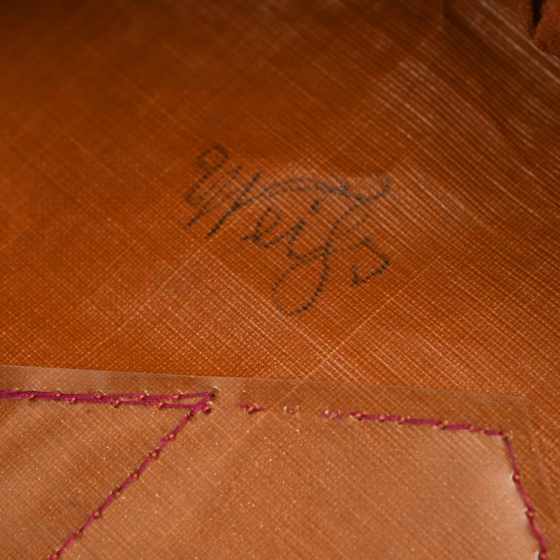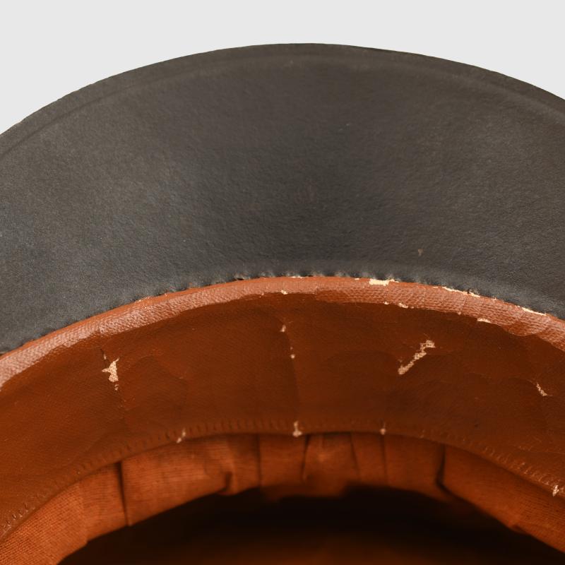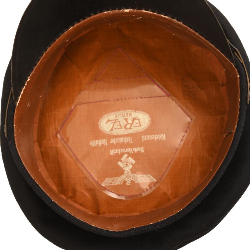 A very nice condition Erel produced visor cap for an enlisted mans in the Teno Organisation . All dark blue body with matching dark blue centre band, fitted with the stamped aluminium twinset of insignia of the Teno with the national cockade to the centre of the lower cockade. Standard black patent chinstrap with double oval buckles. The hat is of large proportions, possibly size 58. The interior is lined in the waterproof russet brown material, which has cracked in places. The sweatband is also of the darker tan ersatz imitation leather. The centre celluloid lozenge is all complete, below the lozenge it is beautifully silver blocked. Teno eagle and insignia with the ‘Erel’ trademark. A faint hand applied original owner’s name is also applied to the russet brown headlining. Good saddle shape, no damage of any type.