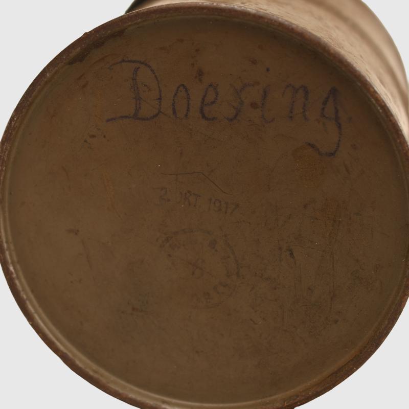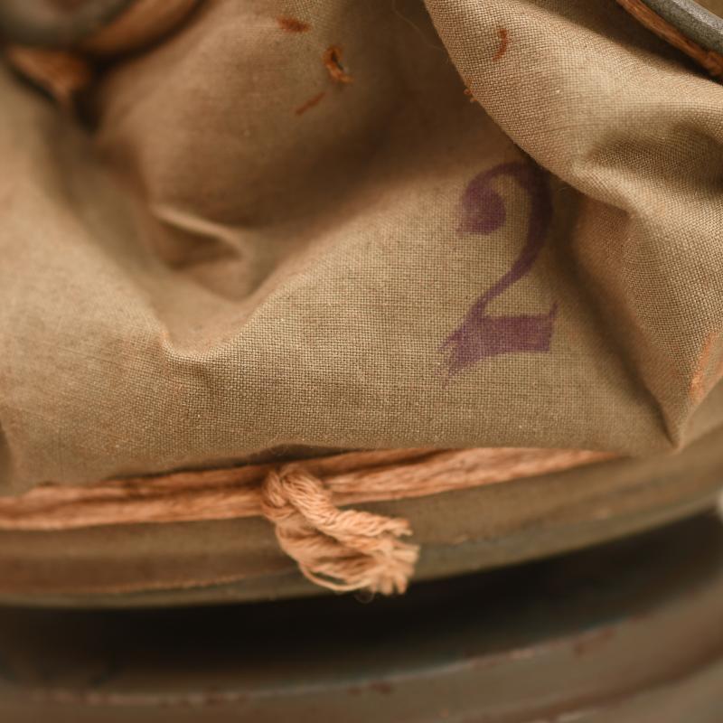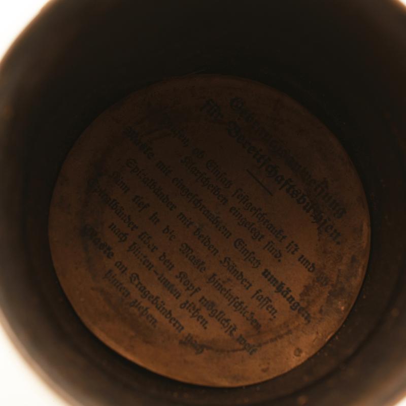 Generally excellent condition, lenses good, the face mask itself firm and undamaged with all of its head fitting tapes. The filter has some areas of rust to the centre. Profusely rubber ink stamped with the date ’14.4.17’ plus other identifying numbers with a maker’s stamp of ‘G.J.B.1917’. Fitted into its original carrying tin, which retains virtually all of its field grey finish and all its carrying straps. Six spare lenses are included into the compartment to the inner upper lid and the paper instructions for the use of the mask are still intact at the base of the tin. An original owner’s name is hand applied to the base of the tin with further dates of ‘1917’. The face mask rubber has a good degree of solidifying and we have not squashed the mask to close the lid for fear of damaging the face mask material.