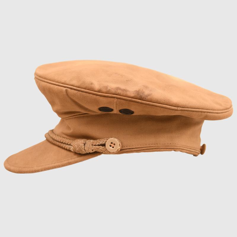 A nice service worn example of the 1st pattern Hermann Meyer cap, these are distinguished by the fact of having in many cases tunic eagles fitted with a single tropical red, white and black cockade below. Stamped inside size ‘56’ by the Company of August Schellenberg and dated ‘1942’. The manufacturer Schellenberg were distinguished within the production companies of the Hermann Meyer cap as the only Company having a proud ridge running between the centre band and the upper part of the cap. Also fitted with its original officer style cap cords. The neck flap is missing. Some staining overall to the crown area. This example of cap shown on page 218 of AFRIKA KORPS 1941-42, VOLUME 2.