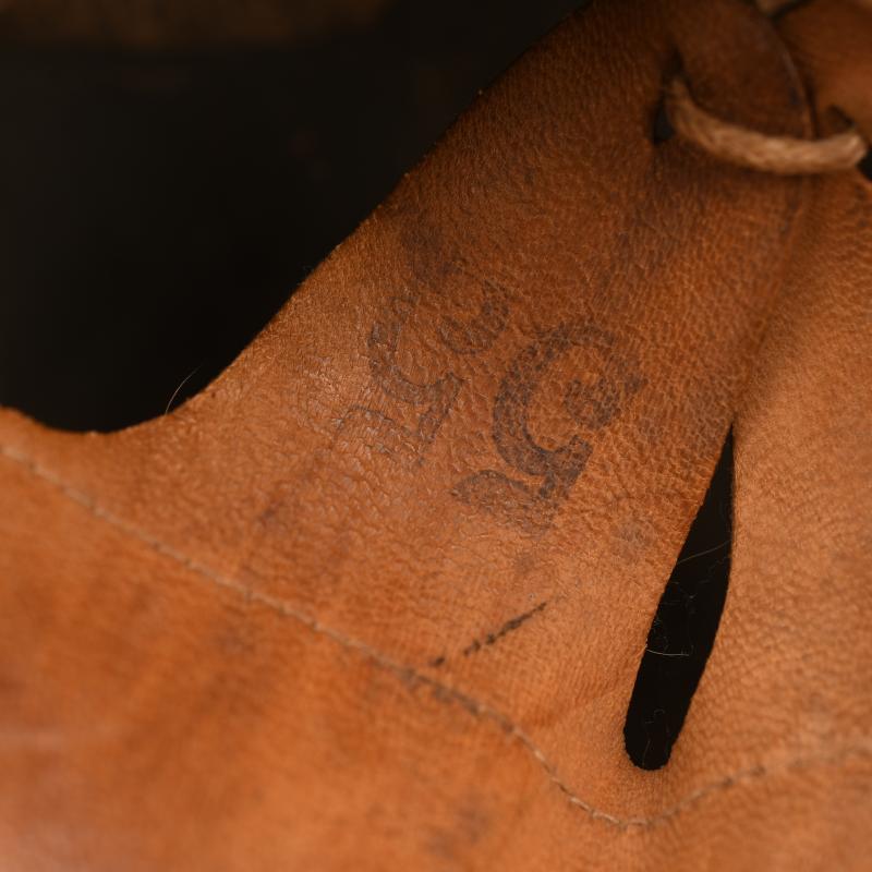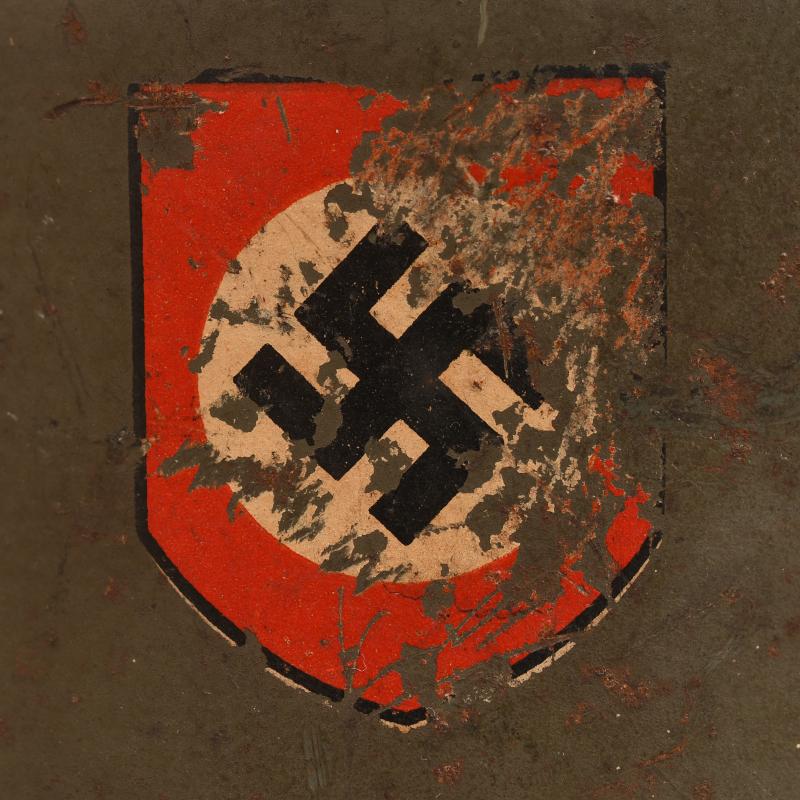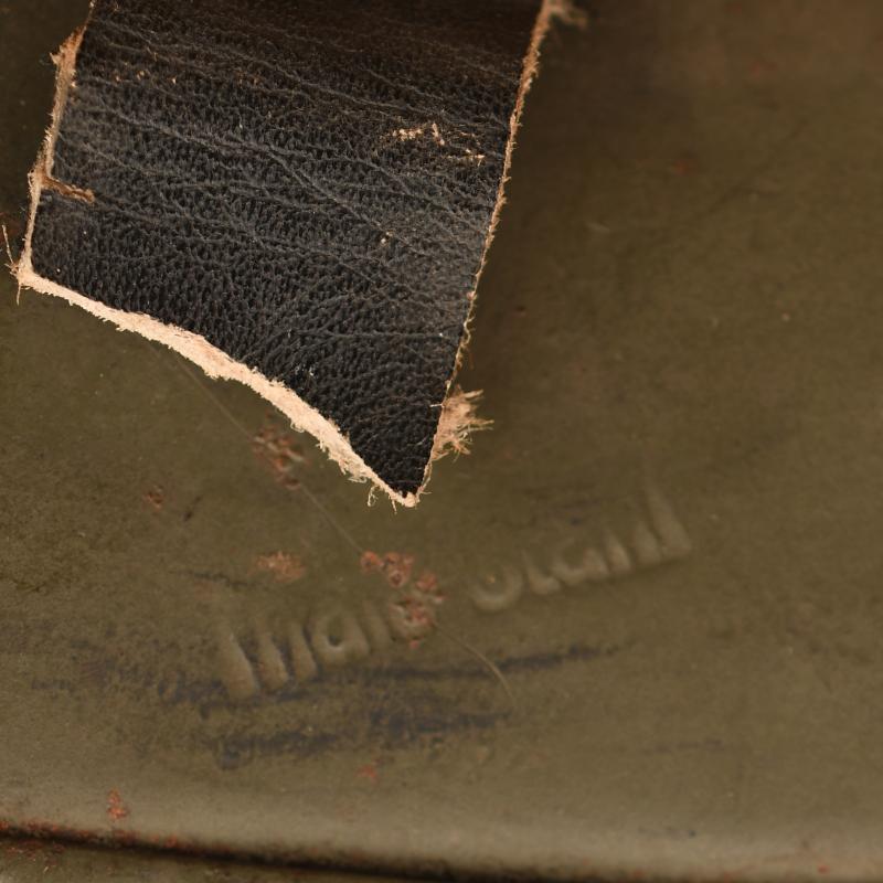 The M.34 style helmet retaining virtually all of its apple green finish with some slight rust bleed. One of the liner retaining rivets is missing. The Pocher runic shield fully visible with just minor abrasions. The swastika decal having more distress to the right hand side of the decal. The interior body is stamped ‘THALESTAHL’. The inner liner is all complete with good colour showing some service use, with its original drawstring, the strap unfortunately has been cut. Pasted to the interior upper inner skull is a small remains of a newspaper that appears to have Italian text. This particular type of helmet is fully explained on pages 80, 81, 82, 83,84 and 85 of the excellent work SS Steel by Kelly Hicks. All three of the inner leather liner pads have their interior cushion pads fitted. More extensive, extra images can be seen on our new Premium website, type in regimentalsmilitaria.co.uk in to your web browser.