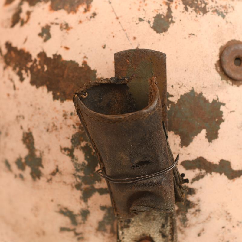 A fabulous souvenir from the North African desert war being the standard Italian combat helmet of WWII, painted in a desert hue of pink. Web images can show how much of the paint finish is left, thankfully enough to give this helmet the character it has. Interestingly the colour that has been painted is virtually identical to the colour painted to the British Long Range Desert Group and SAS vehicles of the North African campaign and the same colour has even been used until the 1960’s with the SAS Land Rovers, nicknamed the Pink Panthers. The helmet belonged to one of the most important Italian combat units in North Africa the Bersaglieri. It is complete with its Bersaglieri plume holder and the remains of the plume itself. The plume holder itself, which comprises of a metal and leather construction is also frail, the leather pouch for taking the base of the plume is being held to the metal back plate with the addition of contemporary wire. To the interior the whole section of leather of the Italian interior is complete with the helmet but has completely detached itself from the felt lined liner band. The helmet is with its original drawstring and another very interesting feature is that the original owner of this helmet has managed to obtain a British elasticated webbing chinstrap and fitted it to his own helmet. The British helmet straps being elasticated did not have the need for opening and closing a roller buckle strap. On one side the strap is secured to the strap posts by original period wire, on the opposite side the original period wire has disappeared and has been replaced by a modern green plastic coated wire. This helmet was last owned by us approximately 18 months ago, was sold and has recently been traded back to us.