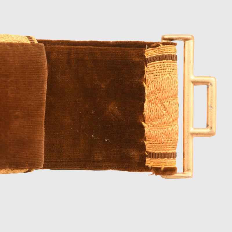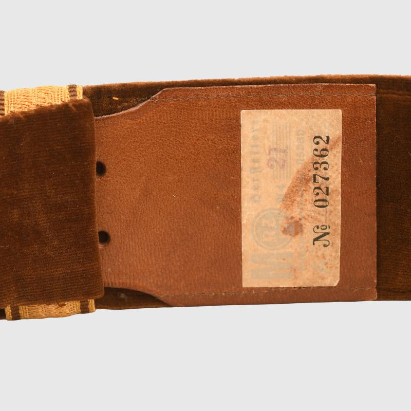 One of the most attractive of all the parade belts of the Third Reich period is the Political Leaders. Beautiful gold leaf exterior brocade laid over political brown velvet backing, complete with its slightly smaller size parade buckle, which retains every bit of its original gilt. Maker marked on the rear of the buckle ‘RZM 4/24. Both the brocade sliders are present on the belt. Complete with its paper RZM ticket applied to the leather adjuster on the reverse side. The leather adjuster itself is marked size 95.