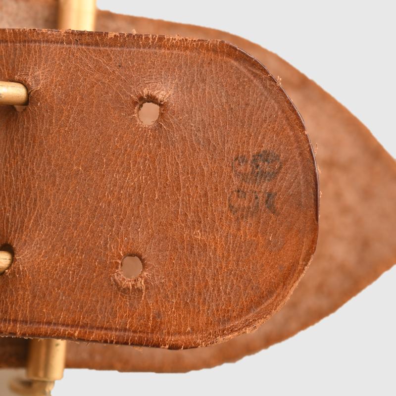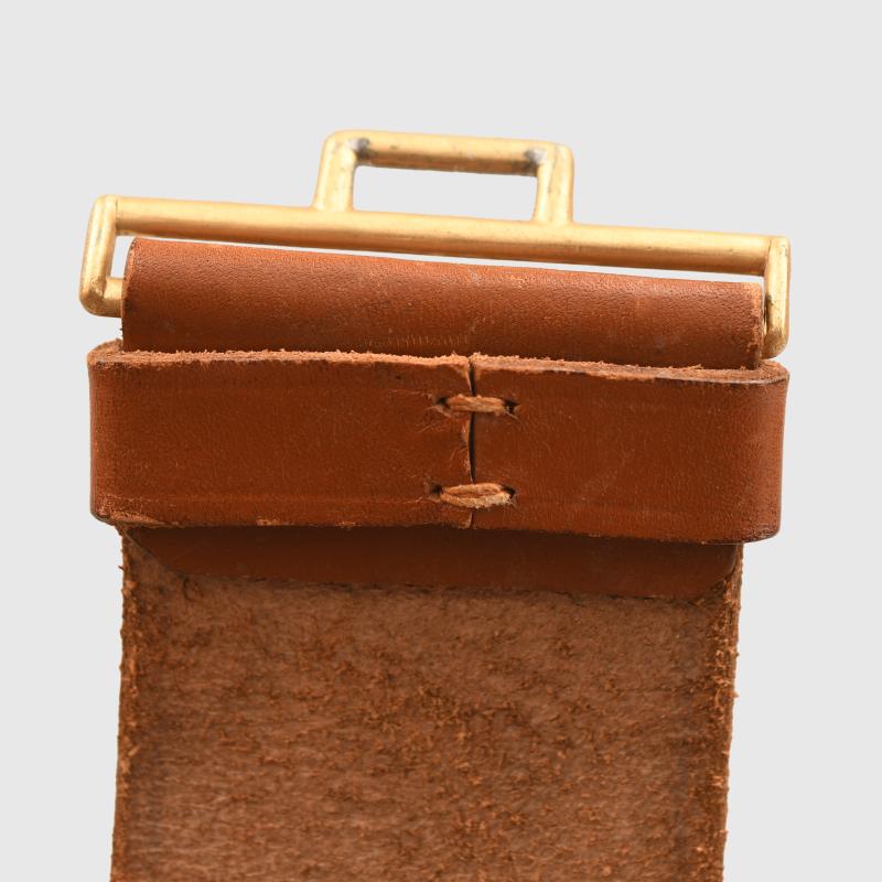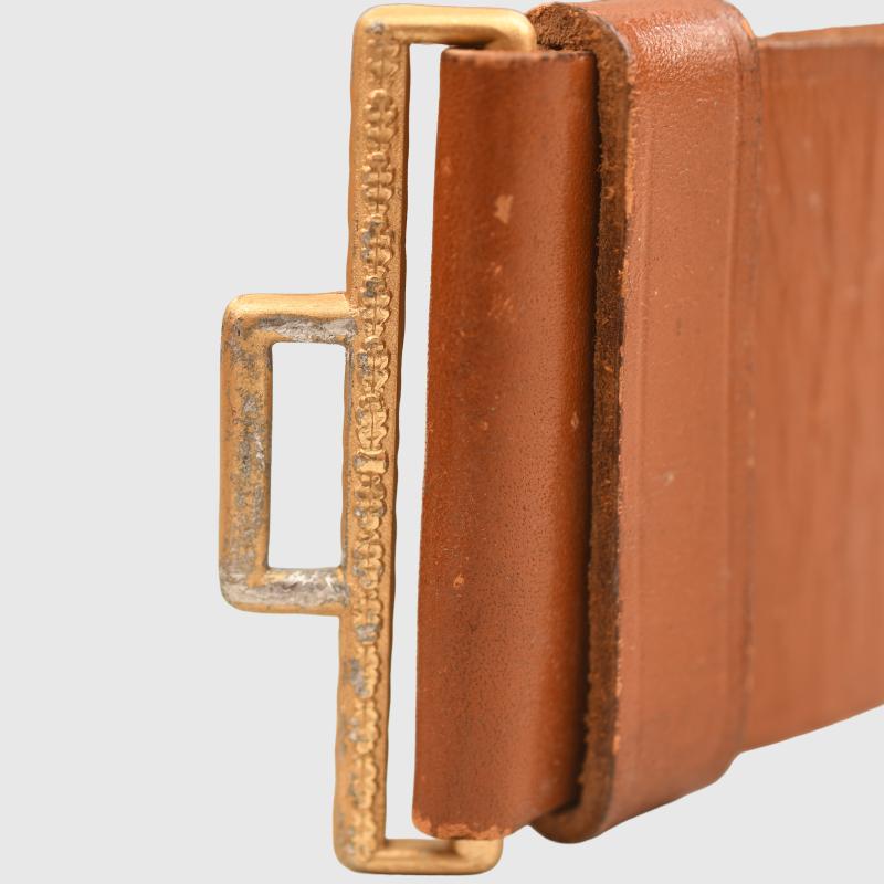 A fabulous condition wide brown service belt as worn with the political uniform. The adjuster tab is stamped size 95. The standard larger size all gilt belt buckle marked ‘RZM M4/24’ with all its gilt. The belt has both of its leather runners present.