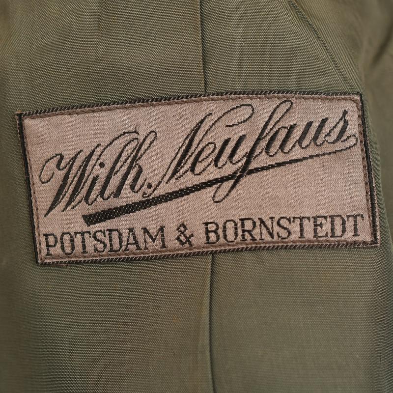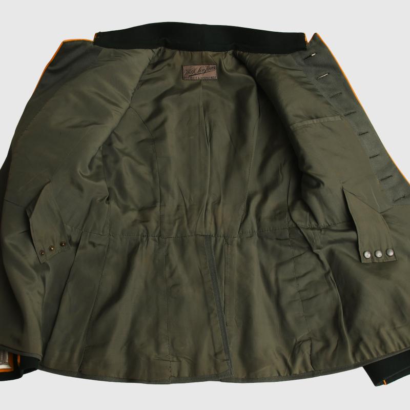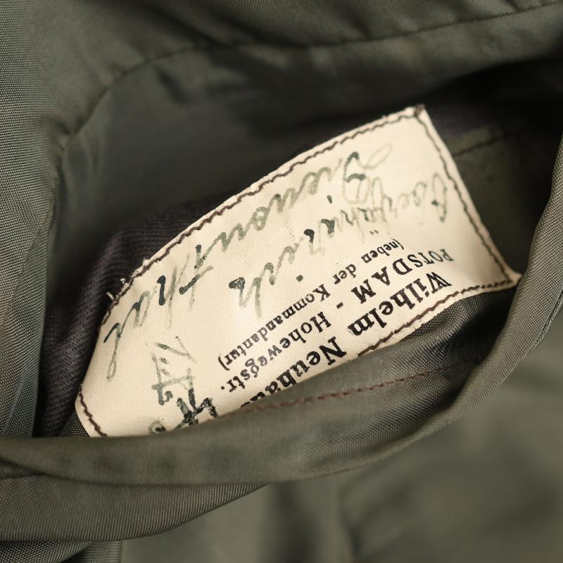 A magnificent condition upper medium size parade tunic for a Leutnant in the 11th Cavalry Regiment. The material is of the finest grey quality contrasting beautifully with its dark green collar and yellow waffenfarbe overall. Standard army officers shoulder boards to the rank of Leutnant with yellow based cloth with the number ‘11’ in gilt attached. Yellow based heavily wire woven collar patches, yellow piped collar and front skirt also yellow piped rear skirt and cuffs to the tunic. A very high quality officers breast eagle attached with a set of adjutants aiguillettes. Silk tailors label of ‘Wilhelm Neufaus Potsdam’ attached to the inner upper section of its lining. To the interior pocket the original matching tailor’s label in canvas with the name of the officer, which is then the rank of ‘Oberfaheriach Diesenthal’ with the date of ‘April 1937’. Two loops for a medium size medal ribbon bar fitted and one set of loops below for another award. The tunic is completely free of any moth damage or stains. More extensive, extra images can be seen on our new Premium website, type in regimentalsmilitaria.co.uk in to your web browser.