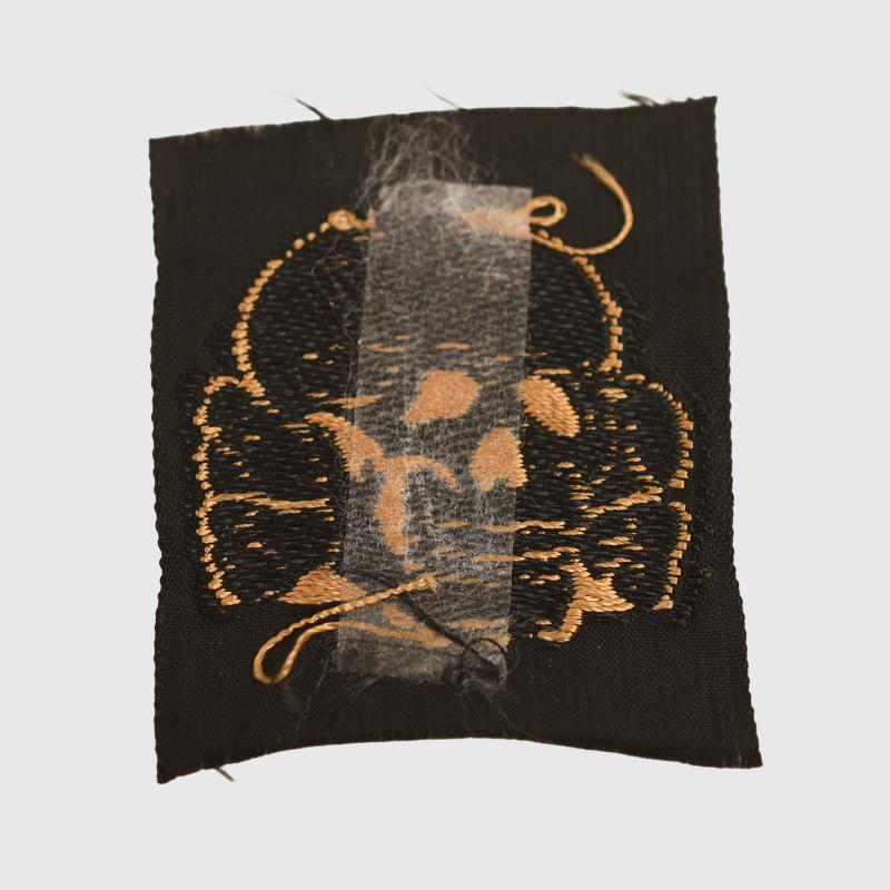 The Bevo woven skull cut from a roll for the Waffen SS field cap. Slightly tan coloured weave to the skull with black surround. The remains of a double sided tape on the reverse side of the skull where it has been adhered to a collectors display board.