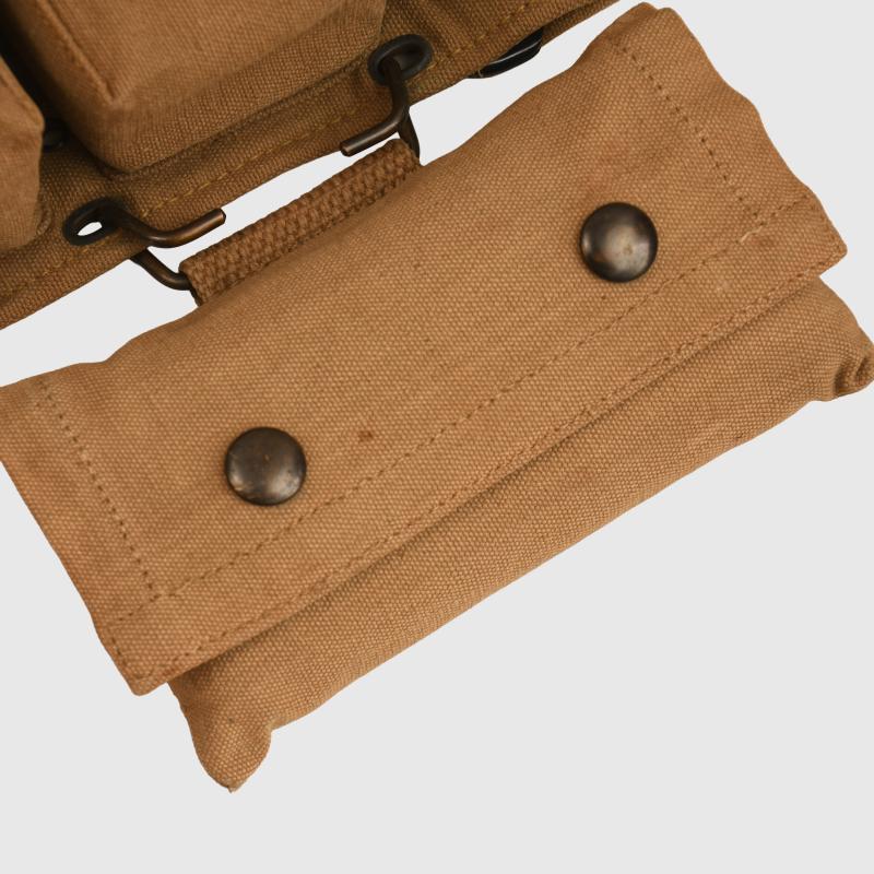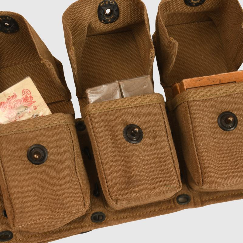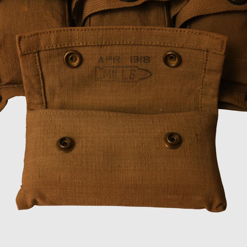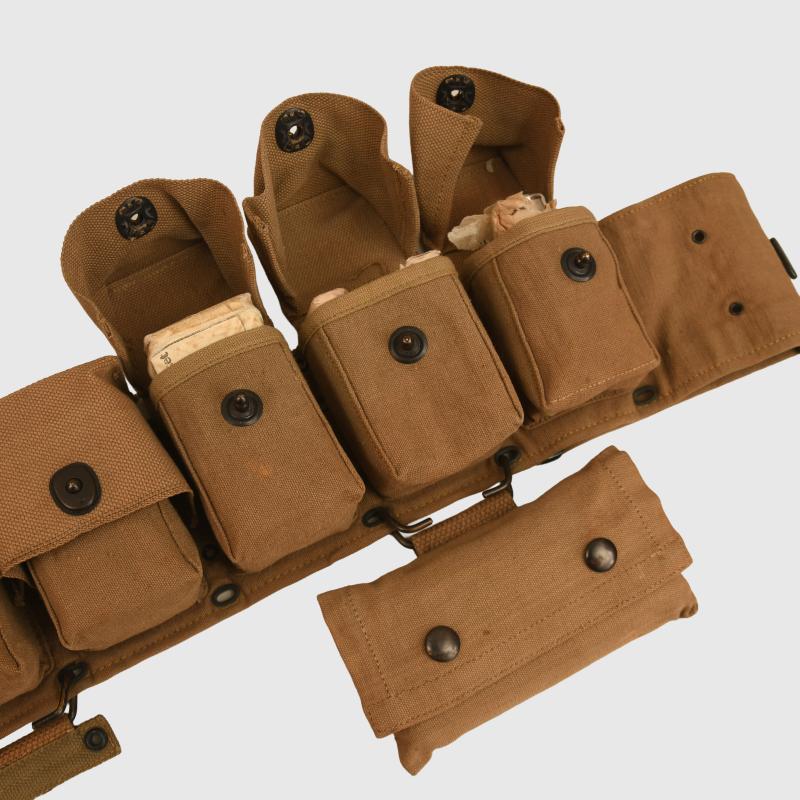 A super piece of equipment, absolutely mint condition being the waistbelt with 10 individual pouches for medical equipment and a further hanging pouch, clearly marked at the back of the belt ‘Mills Company April 1918’ to both the belt and the lower pouch. Each pouch is full of its original contents, the bandages are marked ‘December 1917’ the lower pouch having a small compliment of original instruments and a diagnosis tag booklet marked ‘U.S. Army for use amongst sick and wounded on the battlefield’ with its original pencil.
