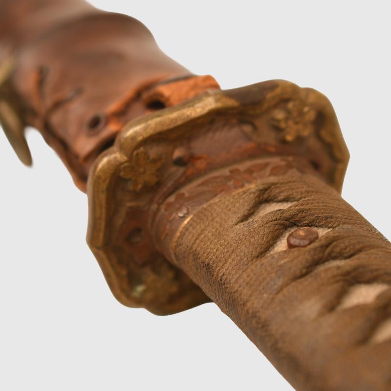 Blade with beautifully wavy hamon. 23 ½ inches or 60cm blade, complete with standard military fittings. The hilt binding is excellent, the ray skin below the binding is chipped in places, the gilt is slightly dull to the fittings. Fitted into its wooden scabbard, covered with a leather combat cover, some slight scuffing to the leather at the lower end and minor splitting of the stitching. The tang is signed on both sides with numerous Japanese kanji characters. More extensive, extra images can be seen on our new Premium website, type in regimentalsmilitaria.co.uk in to your web browser. The sale of Knives, other Edged Weapons and Firearms are restricted to those aged over 18. Verification of age is required before purchase is concluded, this will include providing a scan of photo ID including your address and in some cases may require video verification by FaceTime or WhatsApp video, at Regimentals discretion, until formal laws on this requirement are enforced in the UK.