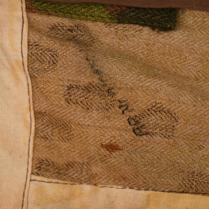 A mint stored pair of the 44 pattern camouflage trousers, part of the two-piece suit. Good bright colours to the camouflage finish and pattern. No moth damage anywhere on the trousers. Complete with its belt loops. All buttons complete including the pocket closure buttons. The adjustment belts on each side of the waist are complete, with rust to the buckles. Light rust stains to the interior white cotton lining. Faint traces of the original size stampings still visible to the waist band. Standard reinforced double thickness seat area. Cloth tabs for securing the base of the trousers around the foot of the wearer is all intact. An excellent set.