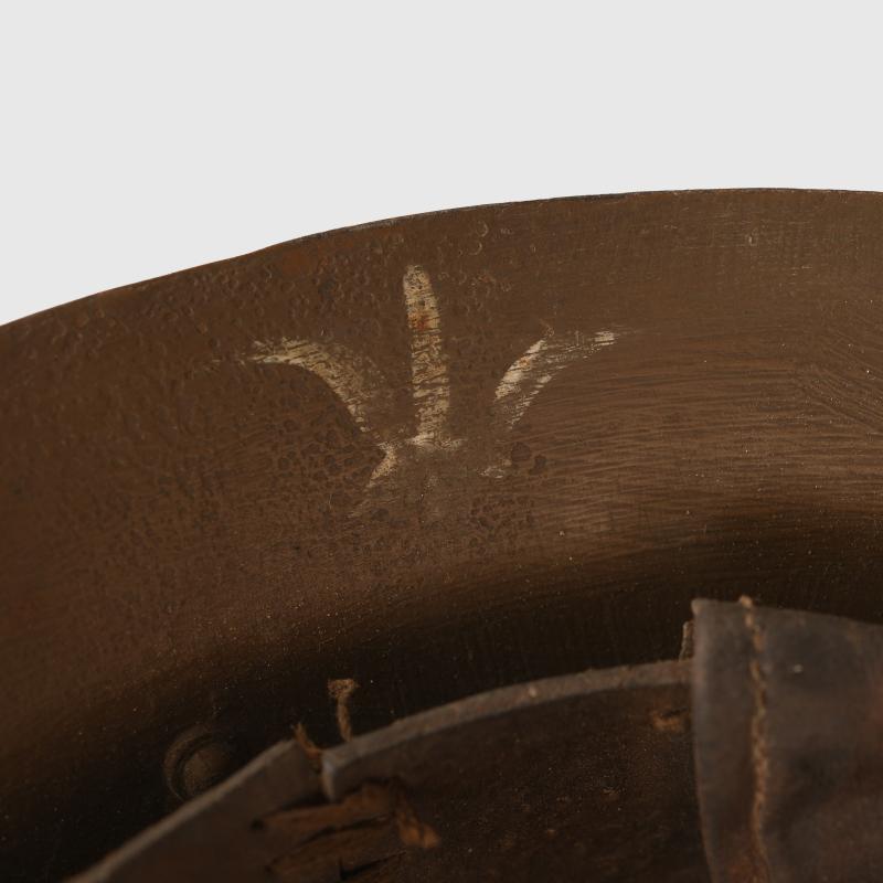 An excellent finish to the exterior with the darker shade of paint that is normally encountered around the lower half of most Japanese combat helmets, with its complete interior liner, all of the three pads have their inner horsehair sections present, with its full webbing chinstrap. Very frail in one area. Kanji numbers to the inner rear skirt.