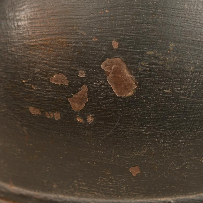 Horizon blue brushed finish with its artillery plate to the front. Some slight chipping to the paintwork but generally good, with its original chinstrap and its complete interior liner. Faint traces of an owner’s name painted in indelible red pen to the rear peak of the helmet.