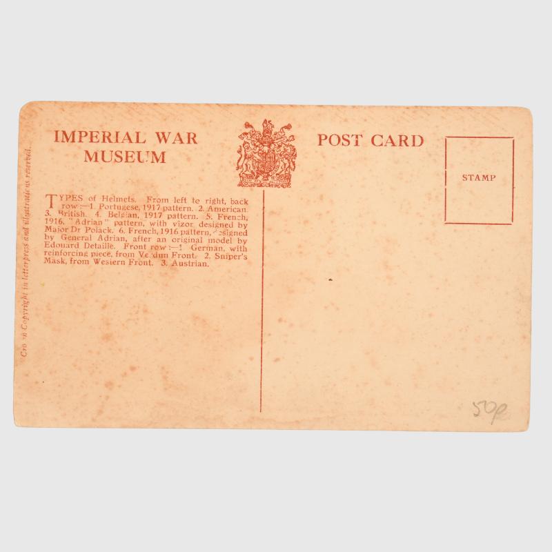 A super postcard published by the Imperial War Museum showing 8 types of steel helmets and 1 elephant face shield, used by Portuguese, American, British, Belgium, French, Austria and German forces of the First World War. The helmets are some of the rarest of WWI including French Polack, the German M.18 with the front shield, Berndorfer, Portuguese with the ribbed skull. Ideal for the in-depth helmet collector.