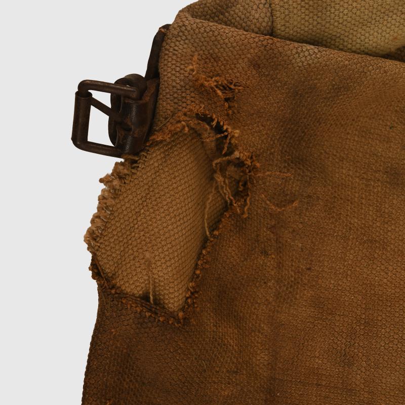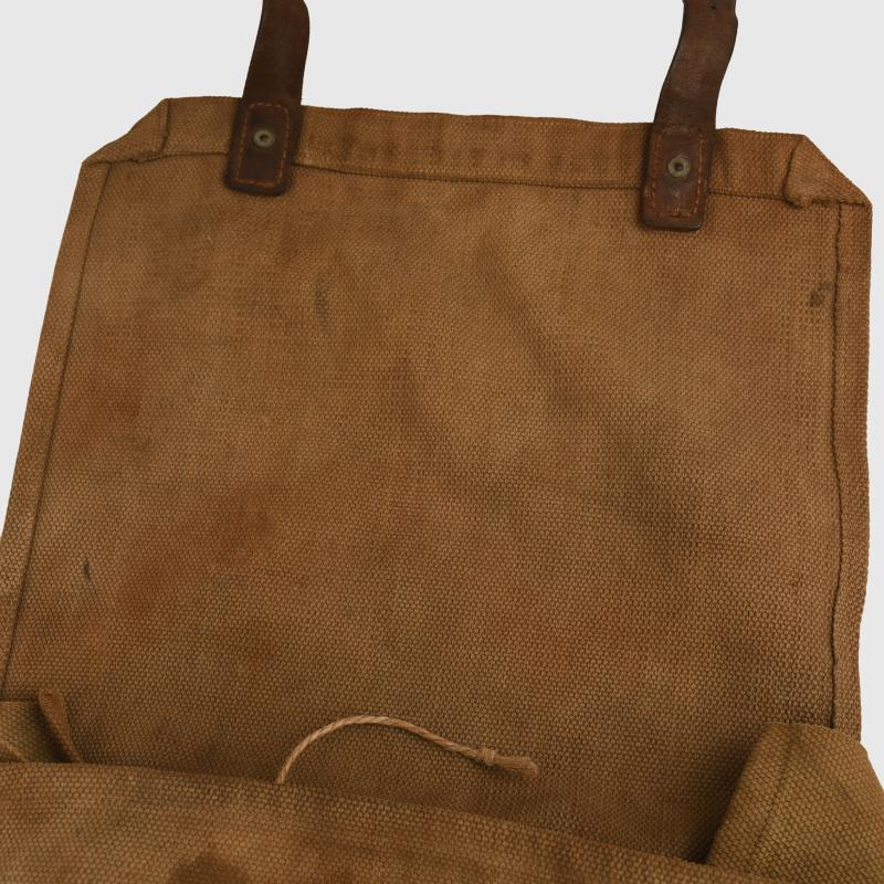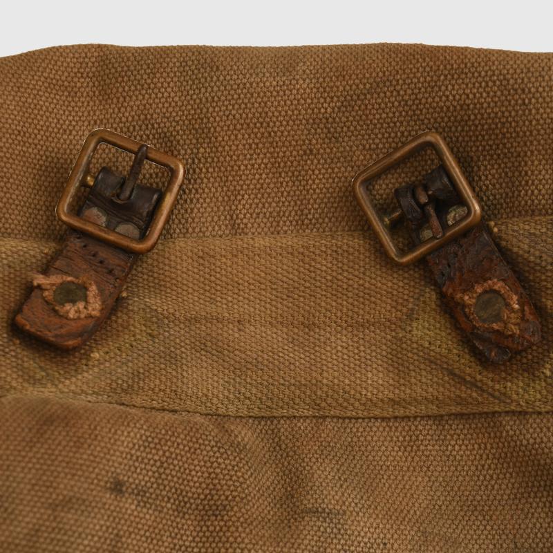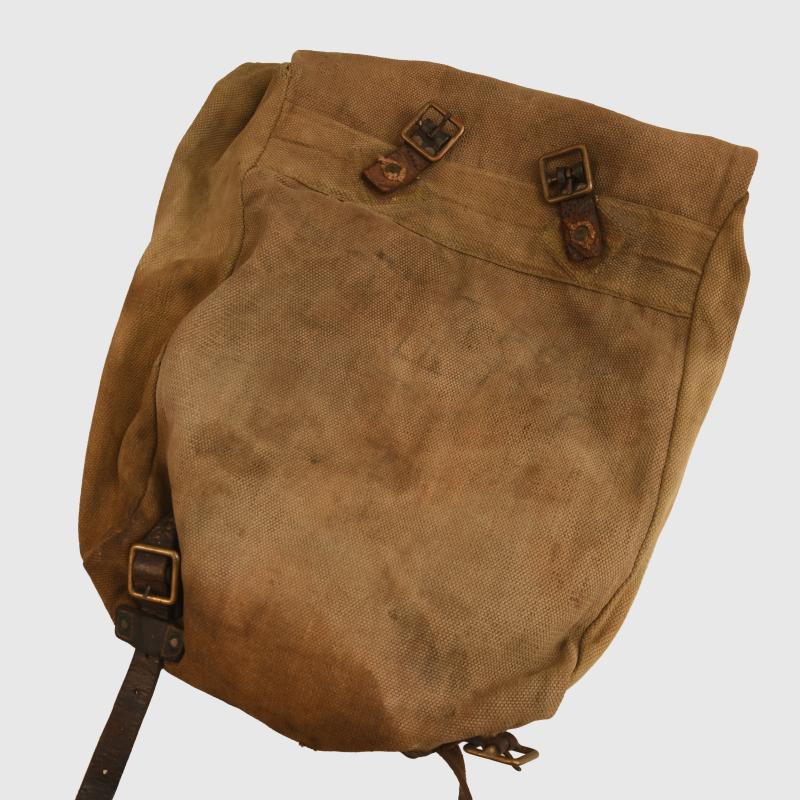 This pack has seen service use and is stained overall, all of its 1914 leather buckles and attachments are complete including one of the long straps, there is a hole to the webbing close to the lower left hand buckle as the pack is viewed, faint traces of original owners name or unit on the large back panel, stitch marks around the two other upper leather buckles indicate this has been modified at some stage.