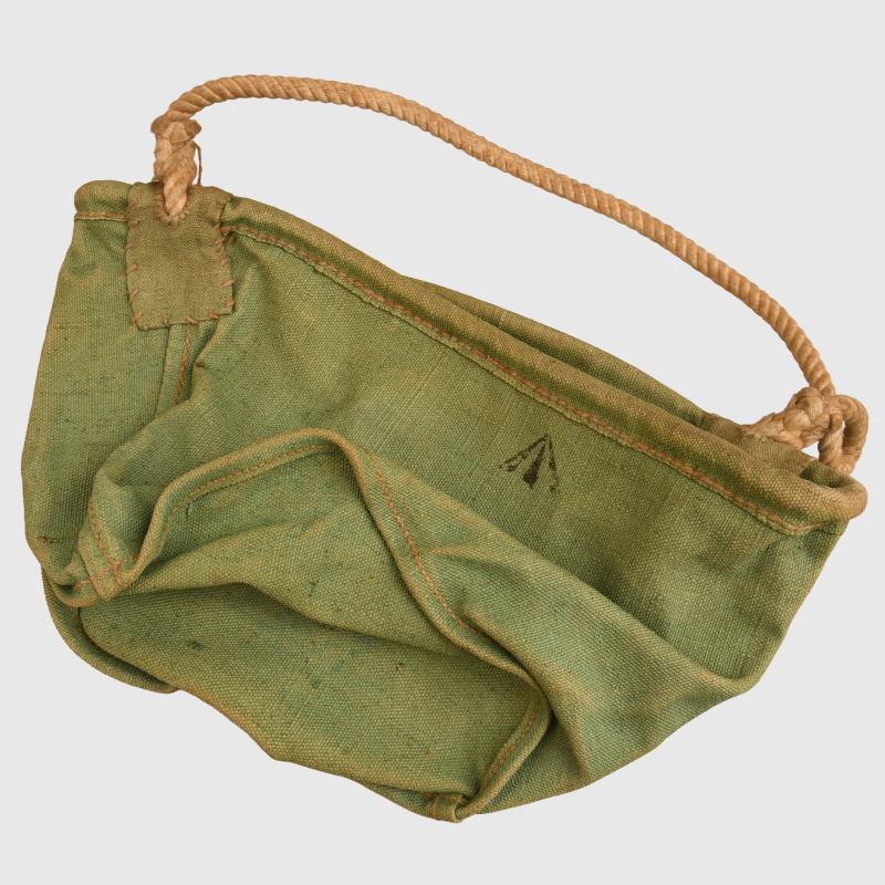 A clean example of the canvas water bucket with its rope carrying handle, broad arrow marked.