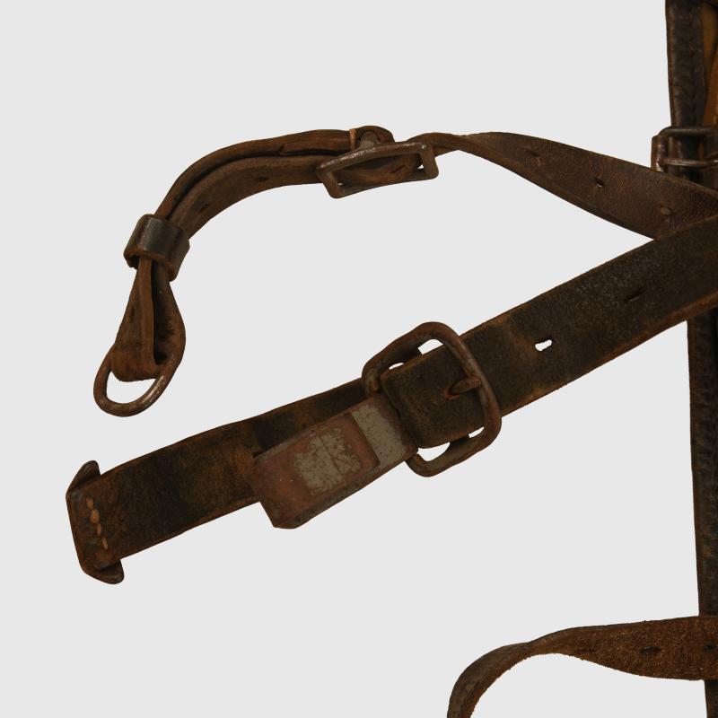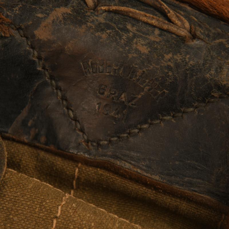 The fur back pack issued to each soldier, this example stamped ‘Austrian Graz’ manufacturer, dated ‘1941’ complete with all its metallic elements. All of the leather strapping soft and supple. The fur is good to the exterior. All the internal canvas and metal fittings all complete.
