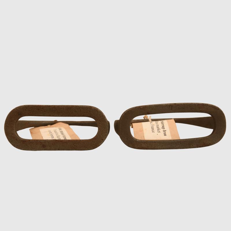 Two British stirrup irons with labels attached found in a flea market on the Somme France, Both slightly different.
