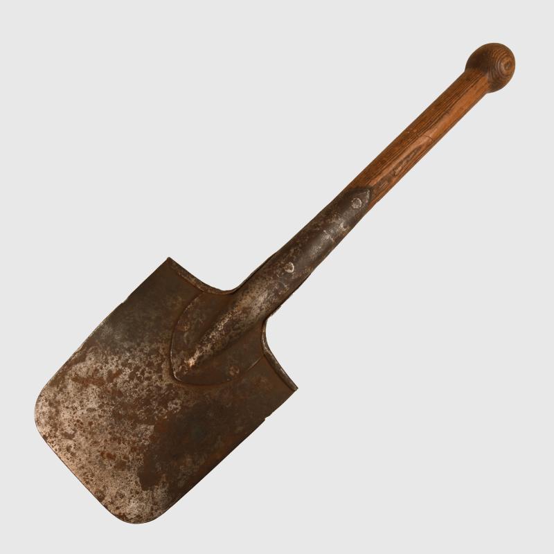 A used German entrenching tool, WWII, maker marked and dated ‘1936’. Some minor corrosion to the head, wood haft excellent.