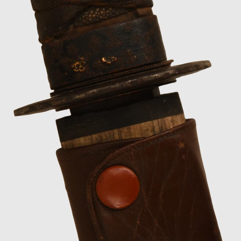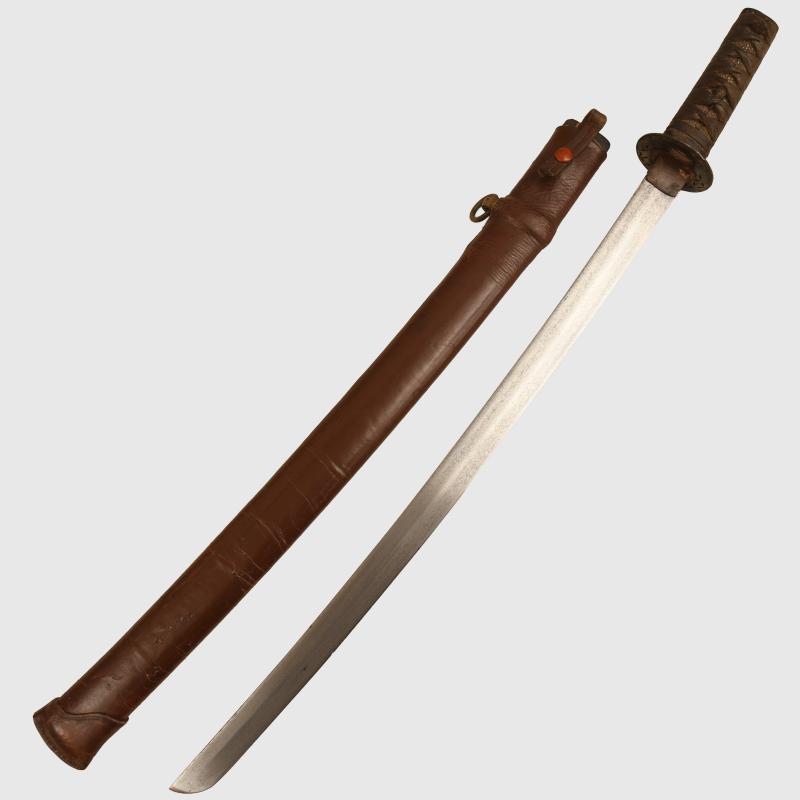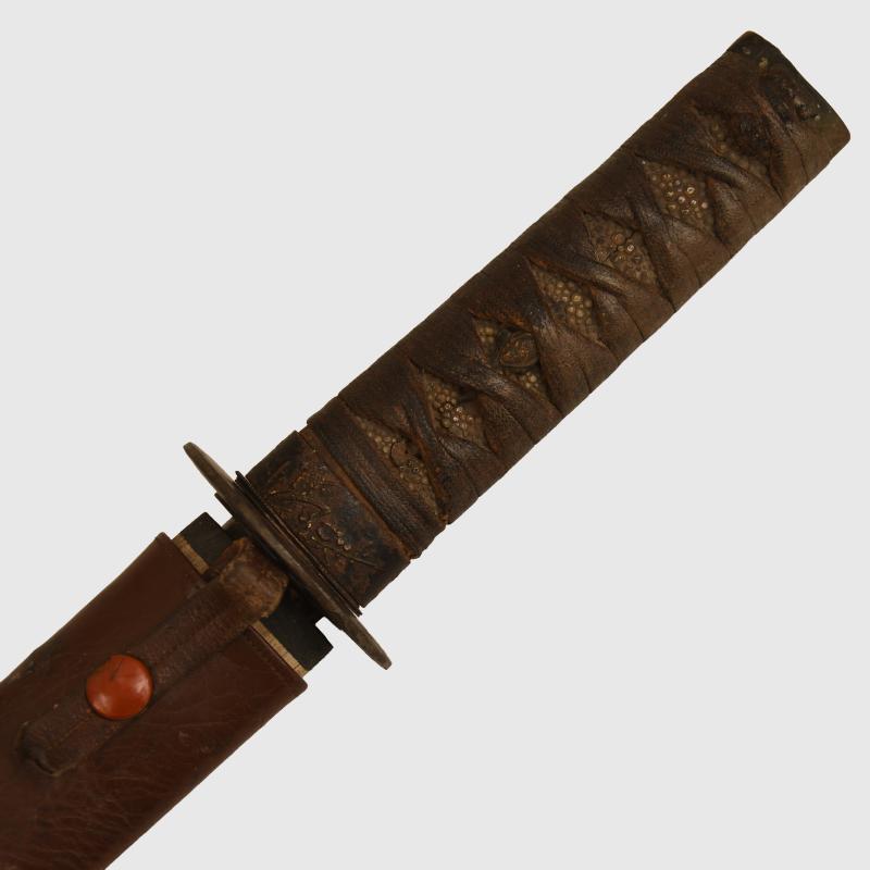 A Japanese Wakazashi having a 56 cm blade. Nice condition, one minor crease at the lower end of the blade, with its Wakazashi hilt fittings, the hilt itself being 14cm long. Some gold still visible to the fittings on the lower grip and underneath the cloth binding to the hilt, known as the menuki. Some piercing to the iron tsuba, which in itself is circular in form. All fitted into its wooden scabbard, which has its own very nice condition combat leather cover. The three press studs that hold the cover closed still operational. The long leather tab, which passes through a pre cut form in the tsuba that holds the hilt into the scabbard is still intact and working correctly. These shortened swords in combat covers were taken with the pilots into the aeroplanes before there Kamikaze attacks. The sale of Knives, other Edged Weapons and Firearms are restricted to those aged over 18. Verification of age is required before purchase is concluded, this will include providing a scan of photo ID including your address and in some cases may require video verification by FaceTime or WhatsApp video, at Regimentals discretion, until formal laws on this requirement are enforced in the UK.