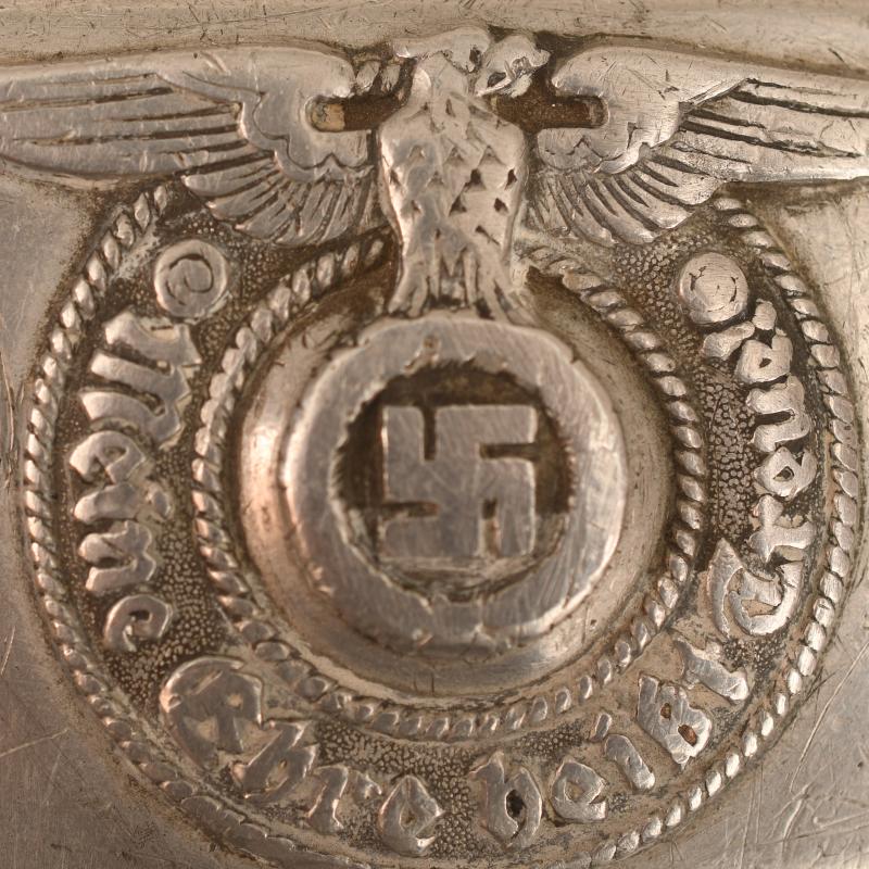 A good service worn example of the die struck aluminium buckle, very faintly marked ‘RZM155/39SS’ on the reverse side, these markings can only be seen with an eyeglass, to the wreath surrounding the central swastika.