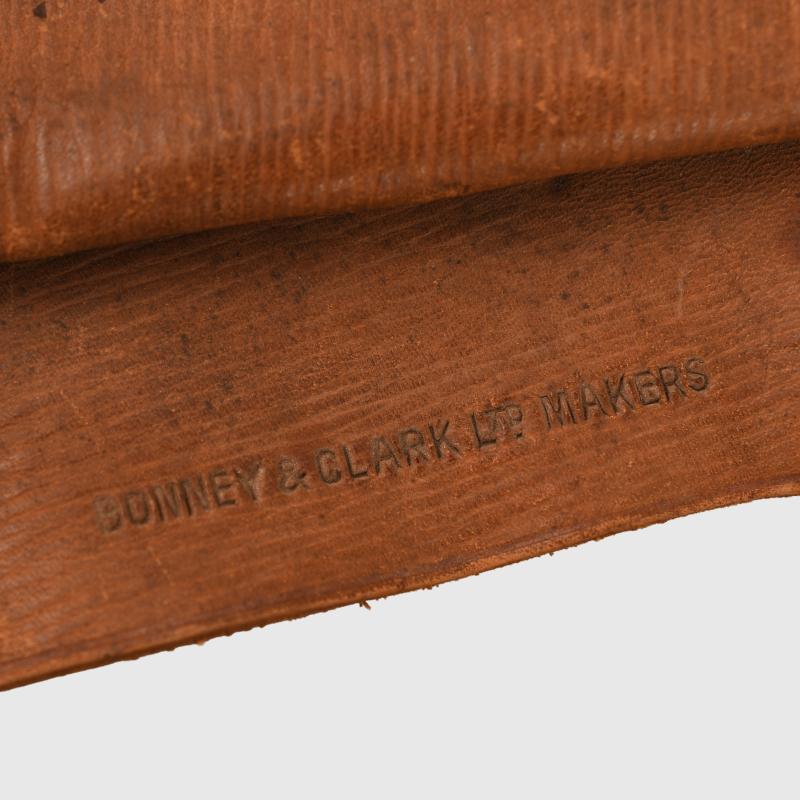 A very nicely constructed light tan leather holster, possibly from kangaroo leather. Stamped ‘Bonnie & Clark Makers’. The holster comprises of one main panel with the aperture for the Smith & Wesson Victory Model 38 calibre revolver (we have tested this exact revolver within this holster), which were widely distributed to Australian Forces under Lend Lease in WWII. The holsters were mainly used by Australian aviators also used by U.S. Marine Corps and naval aviators. To each side of the holster aperture there are six further loops for 38 calibre rounds. The rig has a shoulder strap and a neck strap all with their own individual buckles and two lower waist ties. Excellent condition, evidence of long term storage. A highly interesting holster, ideal for mannequin display.
