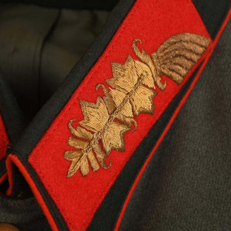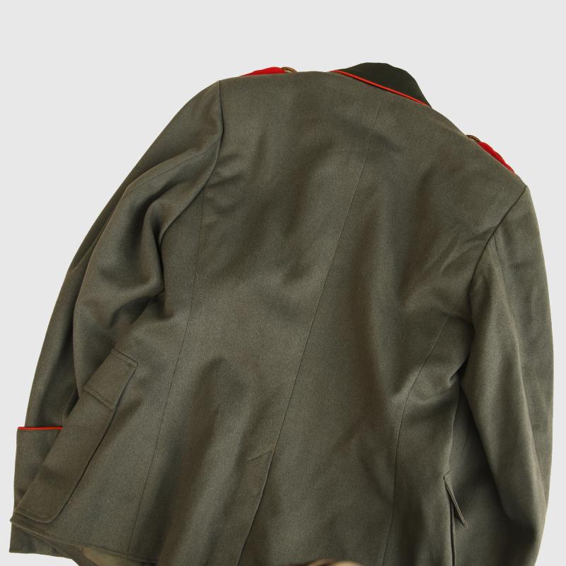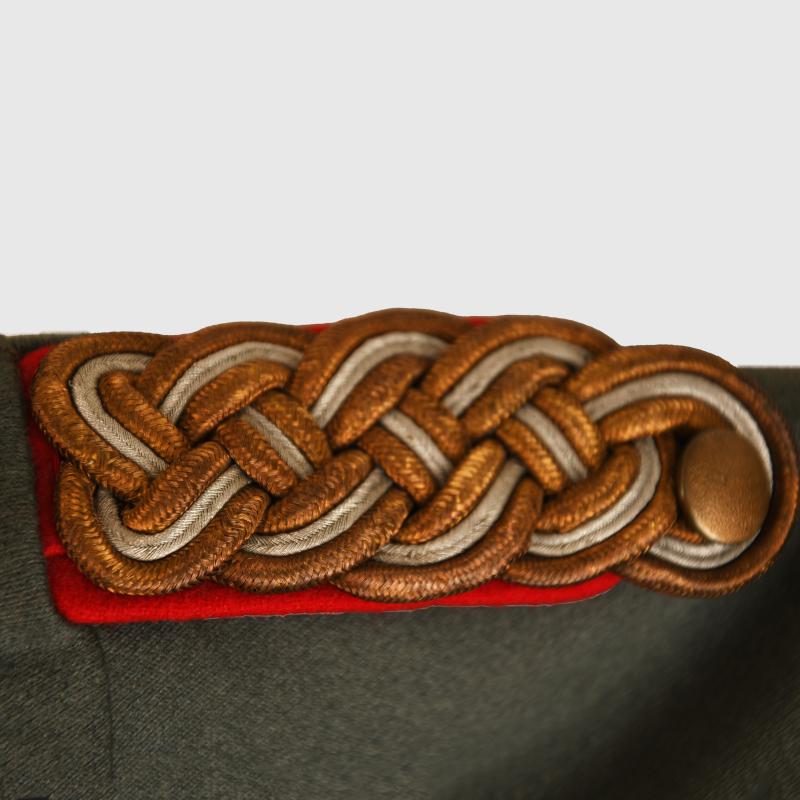 A fabulous General’s uniform being the ex property of Major General Gunther Angern, born March 1893 died 2nd February 1943, a German General in the army during WWII who commanded the 16th Panzer Division during the battle of Stalingrad. He was also a recipient of the Knights Cross to the Iron Cross. He initially joined the Imperial German Army as a junior officer and fought throughout WWI. In the interwar period he joined the Third Reich Wehrmacht and by 1938 was Commander of the 3rd Rifle Brigade. In August 1940, now a Colonel, he was awarded the Knights Cross to the Iron Cross whilst commanding the Brigade in France. He saw service in Russia from August 1941, wounded in Russia and returned to duty as a now General Major in September 1942 and took command of the 16th Panzer Division operating to the north of the city of Stalingrad. Angern remained in Stalingard throughout the siege and was promoted to General Lieutenant in January 1943. He stayed with the army after failing to escape the encirclement by the Russian and he committed suicide on the 2nd February 1943. Excellent condition M.36 style piped uniform with the front skirt of the tunic piped in red, the upper cuffs piped in red, the dark green collar also piped in red. Very high quality bullion wire collar patches fitted with matching General Majors bullion wire gold and silver lace with red underlay shoulder boards. Fitted to the upper left breast is a matching gold bullion wire on green breast eagle. All of the buttons match in gold. To the upper right breast there are five loops for a medium size medal ribbon bar with loops below for two awards. To the interior a silk woven Leipzig tailor’s label, to the interior of the pocket the canvas label of the same tailor with the name ‘Gunther’ to the interior number ‘599’ dated ‘11/3/41’. Also to the interior a sword or dagger hanger clip with a hole tailored through the lower left hand pocket. A pair of grey Generals breeches with the correct pattern of red stripes to each seam. The whole uniform is totally free of any moth damage or staining.