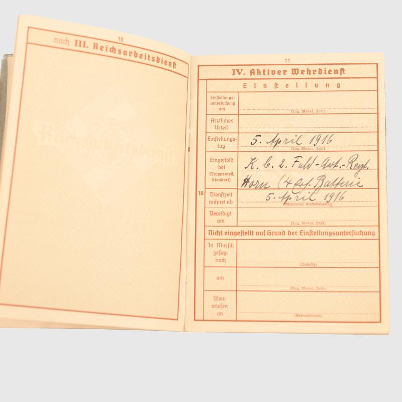A clean virtually unused condition example of the soldiers Wherpass, this document was generally held at area headquarters, the soldier himself carried the document known as the Soldbuch. Photograph in civil dress of a man born in 1896, so by 1939 would be regarded as a reservist, page 12 showing his war service in World War I from 1916 through to 1919 in various field artillery regiments, many other World War II period Third Reich stampings. A good clean example of the Wherpass.