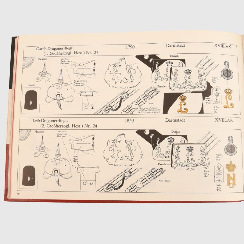 First published in 1984, this was the first ever book on the subject of the German headdress known as the pickelhaube and its associated helmets that gave in-depth detail to the collector as how to identify various helmets and regiments We bought our own copy in 1984 and still use to date, virtually every week, our own copy is battered and beaten with the spine having to be re-stitched. This absolutely superb example of its 1984 book is a must for anybody wishing to learn about the Imperial German helmets. The book is published in three languages, English, German and French with some good colour photographs throughout the book. Other than the colour photographs, most of the pages are of line drawings, which normally one would associate with poor quality, not in this case, the drawings are professionally done and all of the colours of the parts of the helmet, whether they be silver or gold, are highlighted in such. It lists every Regiment of the Imperial German Army and all the small details that is needed to identify whether the helmet you are being offered or you have seen is absolutely correct and has not been switched around with parts from other helmets. The book shows you the shape of the front peaks of the various types of the helmet, known as the pickelhaube and all of the colours of the individual cockades on the afore-mentioned type of helmets.