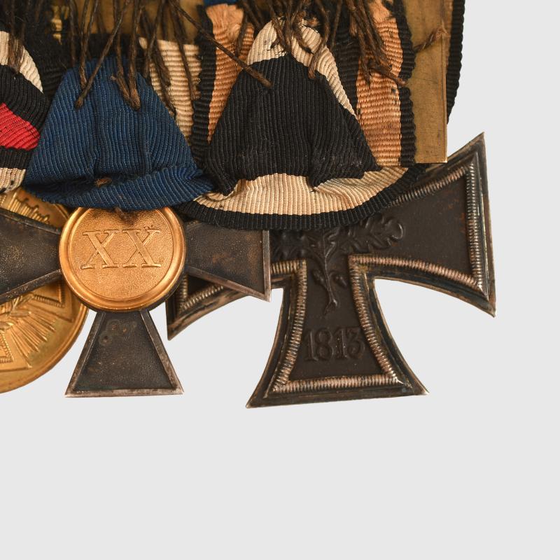 A scarce group of five awards comprising the 1870 dated Iron Cross 2nd class, a Prussian 20 year Long Service Medal, the 1870/71 Commemorative Medal, the Prussian Hohenzollern Medal of 1851, finally the Prussian Commemorative Cross 1860. Ribbons faded and worn, all mounted, its original mounting pin complete with the last bit of the retaining hook broken away on the reverse side.